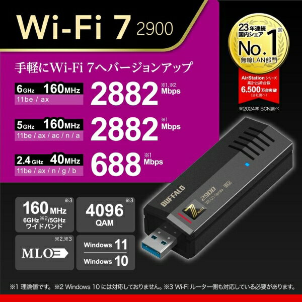 【返品種別B】□「返品種別」について詳しくはこちら□■新製品■2025年11月 発売メーカー保証期間 1年※初期不良・修理対応など、ご購入後の製品に関するお問い合わせは「バッファローサポート窓口」をご利用ください。TEL 0570-086-086(受付時間 月〜土・祝 9:30〜18:00、 日 9:30〜17:30 ※日曜日は無線LAN・Wi-Fi製品のみ受付)◆お使いのパソコンを「Wi-Fi 7(11be)」にアップグレード USB端子に装着して高速化本商品は、Wi-Fi 7に対応した無線LAN子機です。パソコンのUSB端子に装着して、Wi-Fi 7の高速通信が可能です。本商品はUSB 3.2(Gen1)に対応しているので、Wi-Fi 7のスピード性能を余すことなく活かすことができます。◆3つの周波数帯に対応一般的に普及している2.4GHz帯、5GHz帯のほか、Wi-Fi 6Eから新しく使えるようになった6GHz帯のWi-Fiに対応しています。これにより、3つの周波数帯から1つを選んで通信することが可能です。6GHz帯は、2.4GHz帯や5GHz帯と比べて利用者が非常に少ないため、混雑や干渉が少なく安定した通信が可能です。◆最大転送速度が6GHz/5GHzで従来品(Wi-Fi 6/6E)の約1.2倍に向上本商品は、全周波数帯でWi-Fi 7(11be)に対応しています。従来に比べ、6GHz/5GHzでWi-Fi 6/6E(11ax)の約1.2倍の高速転送を実現します。Wi-Fi 6E以前の通信規格(11ax/11ac/n/a/g/b)でも接続できるため、お手持ちの無線LAN親機が古くても、親機が対応する最も速い通信規格で接続できます。◆ドライバーを商品本体から直接インストールできる、CDレスインストール本商品本体にドライバーを内蔵しているため、商品をパソコンに接続してインストーラーを実行するだけでドライバーをインストールすることができます。パソコンに光学ドライブが搭載されていなかったり、パソコンをインターネットに接続できなかったりする場合でも、簡単に使い始めることができます。◆電波の利用効率を向上 遠距離や障害物が多い環境でも安定通信 複数のアンテナの電波を同時に届かせる「ビームフォーミング」対応本商品は、親機が子機の位置や距離を判別して、複数のアンテナの電波を同時に届かせ高いスループットを実現する「ビームフォーミング」に対応しています。遠距離でも電波感度、通信速度を維持することができ、障害物が多い環境においても、安定したWi-Fi通信ができます。Wi-Fiルーター(無線LAN親機)側もビームフォーミングに対応している必要があります。◆たくさんつないでも速度が落ちにくい「MU-MIMO」対応複数端末の同時通信を可能にする MU-MIMO に対応。本商品は 2×2 の商品で、4×4の親機とは本商品を最大2台で同時通信でき、快適な通信が可能です。※Wi-Fiルーター(無線LAN親機)側もMU-MIMOに対応している必要があります。※Wi-Fiルーター(無線LAN親機)によって同時通信の最大接続数は異なります。◆卓上用USB延長ケーブルを付属 直挿し・据え置きを選べる本商品には、据置きできる卓上用のUSB延長ケーブル(1m)が付属します。柔らかい素材を採用しているため、自由な設置が可能です。パソコンに直挿しして気軽にお使いいただくほか、見通しの良い卓上に設置して、快適な通信を期待することも可能です。◆強力な暗号化方式「WPA3 Personal」に対応無線LANセキュリティーの新規格「WPA3 Personal」に対応。従来規格の「WPA2 Personal」「WPA Personal」にも対応しており、お使いの機器の組み合わせに応じて暗号化方式をお選び頂けます。※「WPA3 Personal」をご利用いただくにはWi-Fiルーター(無線LAN親機)も対応している必要があります。※「WPA3 Personal」はWindows10 バージョン1903以降のみ対応。◆RoHS基準値準拠2006年7月からEU圏で施行された電気・電子機器に対する特定有害物質使用制限指令「RoHS指令」の基準値に準拠しています。■ 仕 様 ■動作環境:温度 0〜40℃ 湿度 10〜85% ※結露なきこと対応機種:USB3.2(Gen1)/3.1(Gen1)/3.0/2.0端子搭載のWindows 11/10パソコン※6GHz は Windows 11のみ対応※USB Hubでの使用は非対応※USB 3.2(Gen1)/2.0増設用ボードでの動作は非対応※USB 1.1での使用は非対応準拠規格:IEEE802.11be /IEEE802.11ax /IEEE802.11ac /IEEE802.11n / IEEE802.11a / IEEE802.11g / IEEE802.11b準拠周波数範囲(チャンネル):6GHz:191〜283ch(5955〜6415MHz)5GHz:W52 36/40/44/48ch(5180〜5240MHz)W53 52/56/60/64ch(5260〜5320MHz)W56 100/104/108/112/116/120/124/128/132/136/140ch(5500〜5700MHz)W56(新電波法対応) 144ch(5720MHz) 2.4GHz:1〜13ch(2412〜2472MHz)※電波法によりW52W53は屋外利用禁止です(法令により許可された場合を除く)。※電波法により6GHz帯の屋外利用は、屋外利用可能な無線親機と接続する場合のみ許可されています。準拠規格(最大転送速度※理論値):IEEE802.11be:最大2882Mbps (6GHz帯)最大2882Mbps※ (5GHz帯)最大688Mbps※ (2.4GHz帯)※セキュリティーでTKIP、WEP(128/64bit)使用時は、最大54Mbps(規格値)で動作します。IEEE802.11ax:最大2401Mbps (6GHz帯)最大2401Mbps※ (5GHz帯)最大573Mbps※ (2.4GHz帯)※セキュリティーでTKIP、WEP(128/64bit)使用時は、最大54Mbps(規格値)で動作します。IEEE802.11ac:最大1733Mbps※※セキュリティーでTKIP、WEP(128/64bit)使用時は、最大54Mbps(規格値)で動作します。IEEE802.11a:最大54Mbps