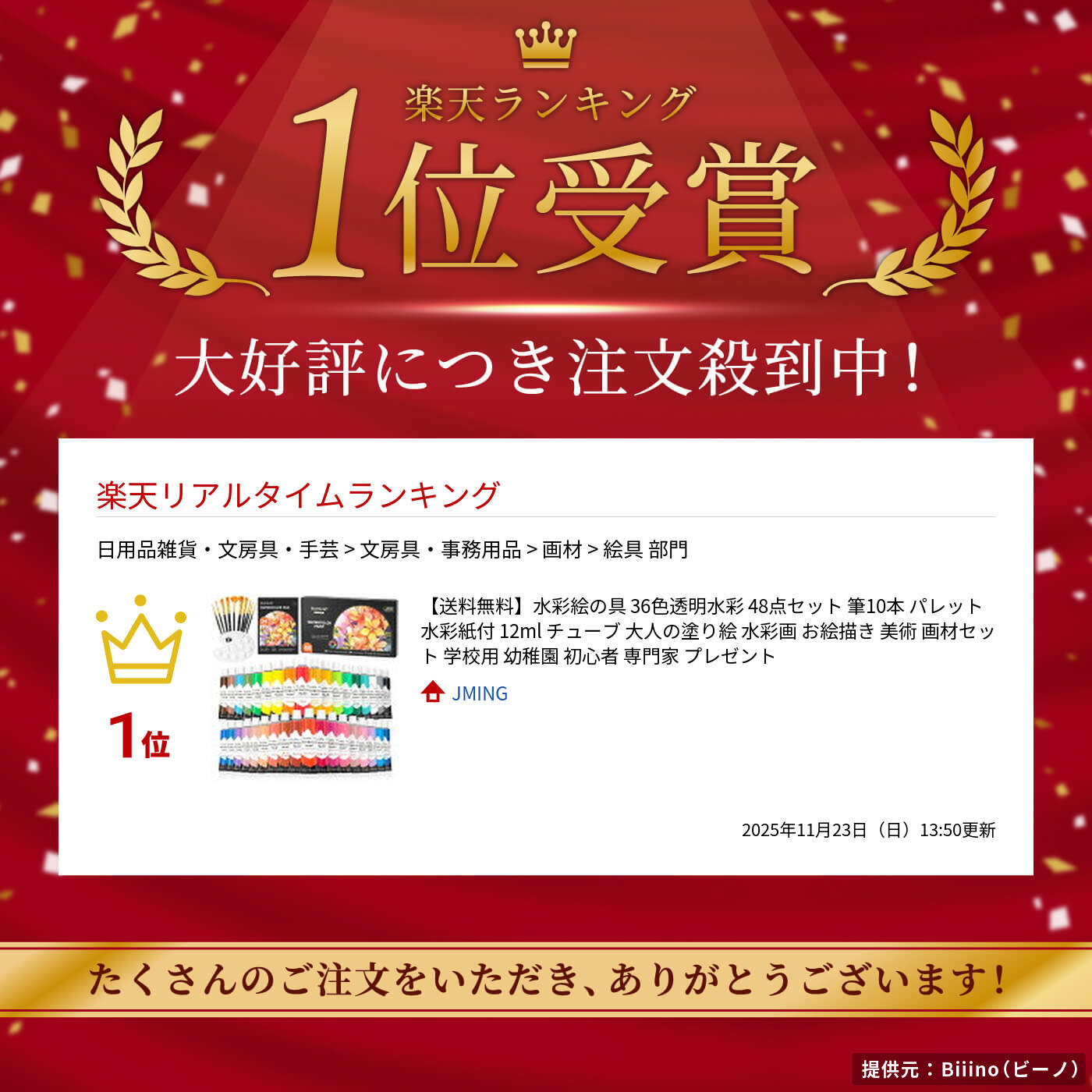 ブランドShuttle Artセット内容【水彩絵の具48点セット】:水彩絵の具×36色、ブラシ×10本、パレット×1個、水彩紙×1冊容量12ml/チューブサイズ【水彩絵の具48点セット】:34.0m x 20.0x 4.4cm重量【水彩絵の具48点セット】:1150g注意事項・当店の商品は全て国内から配送されます。 ・国内配送の商品は国内でのお買い物と同じく消費税が発生いたします。関税はかかりません。 *色がある場合、モニターの発色の具合によって実際のものと色が異なる場合があります。【送料無料】水彩絵の具 36色透明水彩 48点セット 筆10本 パレット 水彩紙付 12ml チューブ 大人の塗り絵 水彩画 お絵描き 美術 画材セット 学校用 幼稚園 初心者 専門家 プレゼント☆Shuttle Art☆36色水彩絵の具☆筆・パレット・水彩紙付☆届いたら直ぐに描き始められます☆🎨セット内容 鮮やかで透明感あり、よい発色の固形タイプの水彩絵具48点セットです。絵の具は大量の36色があり、パレット、ブラシ10本セットと水彩紙1冊はギフト付きで、お届いたらすぐご利用をいただけます。初心者の方でも、簡単に水彩画の醍醐味も楽しめます。 🎨高品質絵の具 色彩豊かで溶けが早く、透明感が特長で、紙にしっかり馴染めます。水を加えて濃淡を作ったり、色を塗ったり、グラデーションが自然で美しいです。色を混ぜても鮮やかさは失わない優れたものなので、にじみ、ぼかし、重ね塗り等その他技法を使っても美しい色を保ち表現します。 🎨信頼できる安全性 ASTM D4236 and EN71安全規格に適しています。非毒、無酸、嫌なにおいはしません。環境と体にやさしいです。手や服に絵の具を付いた場合、水で簡単に流せます。大人も3歳以上の子供も使用できます。 🎨様々な利用シーン 小学生から図工や美術の授業まで、イラスト、絵手紙、大人の塗り絵などお使いをいただけます。透明水彩のように「にじみ」や「かすれ」ができるので、風景・静物・人物などの写実的な表現に適しています。お絵描きの好きな方にとって最適なプレセンになります!