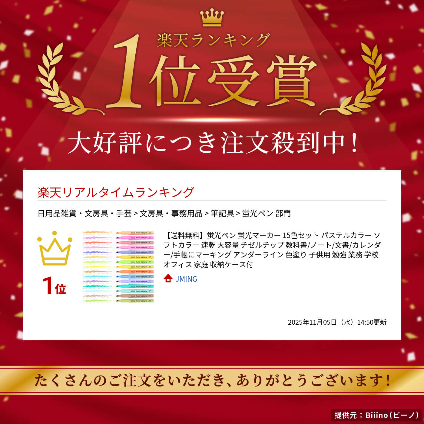 商品情報ブランドShuttle Art色数15色サイズケース:縦200mm x 横145mm x 奥行20mm材質筆軸:プラスチック注意事項・当店の商品は全て国内から配送されます。・国内配送の商品は国内でのお買い物と同じく消費税が発生いたします。関税はかかりません。・当商品はアマゾン倉庫(無地箱を使用)などの委託倉庫から発送させて頂いています。ご了承ください。*色がある場合、モニターの発色の具合によって実際のものと色が異なる場合があります。[送料無料]蛍光ペン 蛍光マーカー 15色セット パステルカラー ソフトカラー 速乾 大容量 チゼルチップ 教科書/ノート/文書/カレンダー/手帳にマーキング アンダーライン 色塗り 子供用 勉強 業務 学校 オフィス 家庭 収納ケース付☆Shuttle Art☆パステルカラー蛍光ペン☆穏やかな15色セット☆手帳・ノートに最適☆🎨【目に優しい15色セット】穏やかなパステルカラーの15本蛍光ペンです。薄めのカラーはチカチカする感じがなく目が疲れずに、お勉強も楽しくなります。ペンからインクのカラーがわかるので、収納ケースやバッグの中からも好きな色を探しやすいです。 透明なケースが付きで、収納や携帯には便利です。 🎨【使いやすい】水性インクで、なめらかな書き味でむらなく塗れるとともに、ざらざらした紙の上でも高い透明感が体験できます。速乾の蛍光マーカーなので、プリント、ファックス、手帳にマーキング、落書き、色塗り、デコレーションしても裏移りにくく、滲まずに色褪せしません。成型の細いチゼルチップで太いマーカーのように色を塗ったり、細くて綺麗な線を引いたりすることができます。握りやすい太さを持ち、子供から大人まで誰でも馴染めます。 🎨【様々な利用シーン】内容チェックをしたり、アンダーラインを引いたりするのはもちろん、年賀状・家計簿・ノートや書類の印つけや図面の色分け等にも簡単に使えます。勉強中に教科書の重要箇所にマーキングしたり、仕事で文書やレポートの情報を強調したり、家庭でカレンダーに記念日などを記入したり、ビジネスやプライベートを問わず日常的にお使い頂けます。 🎨【信頼できる安全性】非毒、無酸、環境と体にやさしいです。いやなにおいはしませんので、長時間を使っても大丈夫です。学校からオフィスまで、幅広く使えます。◎元字を邪魔せないように、元字が乾いた後ご利用ください。ご使用後、キャップをお閉めください。 2
