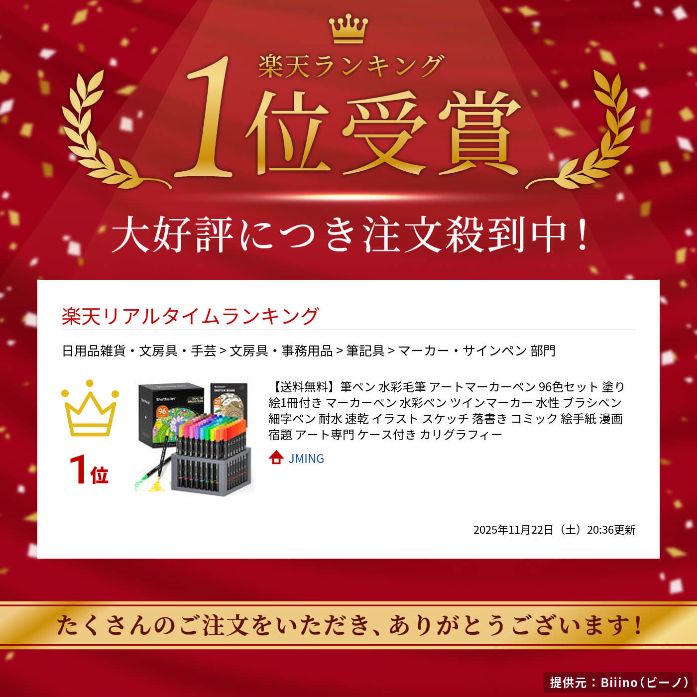 ブランドShuttle Artセット内容イラストマーカー×96色、ペンホルダー×1個、塗り絵×1冊ペン先タイプ細めペン先(1mm)と太めペン先(1-4mm)のツインペンサイズ19.2 x 17.6 x 10.6 cm重量1.27 kg注意事項・当店の商品は全て国内から配送されます。 ・国内配送の商品は国内でのお買い物と同じく消費税が発生いたします。関税はかかりません。 *色がある場合、モニターの発色の具合によって実際のものと色が異なる場合があります。【送料無料】Shuttle Art 筆ペン 水彩毛筆 96色セット 塗り絵1冊付き マーカーペン 水彩ペン ツインマーカー 水性 ブラシペン 細字ペン 耐水 速乾 イラスト スケッチ 落書き コミック 絵手紙 カード 漫画 宿題 アート専門 子供 ケース付き☆Shuttle Art☆マーカーペン☆ツインペン先☆96色セット☆塗り絵1冊付き☆🌈【セット内容】 発色がよく鮮やかで、驚くほど多彩な96色水彩ペンセットです。滑らかな描き心地、乾きが早く、カバー力が抜群です。初心者でも表現の豊かな描画を楽しめます。大人の塗り絵1冊はギフト付きで、届いたらすぐ描き始めます。収納に便利なペンホルダーも付属し、ほしい色が探しやすくなります。🌈【実用的な両用デザイン】 ペンの両端は細字と太字で書けるようになっています。用途に応じて自由に調整できます。細字(1mm)のペン先は極細で、ノード、手帳やカレンダーなどに細部まで書き込むのに適しています。ブラシ(1~4mm)のペン先は水彩毛筆のような柔らかいタッチで、書道、塗り絵や手紙のあて名書きなどに最適です。1本で2タイプの文字を書くことができるし、効率的で便利性の高い筆記具セットです。🌈【信頼できる安全性】水性インクのマーカーペンなので、嫌なにおいはしません。非毒、無酸、環境と体にやさしいです。手や服にインクを付いた場合、水で簡単に洗えます。大人からお子様まで安心してお使いいただけます。◎ご使用後は、キャップをしっかりしめて横置きに保管してください。 🌈【様々な用途】書くに使えるだけではなく、スケッチ、コミック、塗り絵 、描画、落書きや手作りカードなどの様々なニーズを満たし、一般的に室内、風景、製品、産業、建築、環境芸術や他の設計図に適用されます。バッグが付いているし持ち運びに便利なので、公園、学校、ミュージアム、旅行などに持っていくのに最適です。