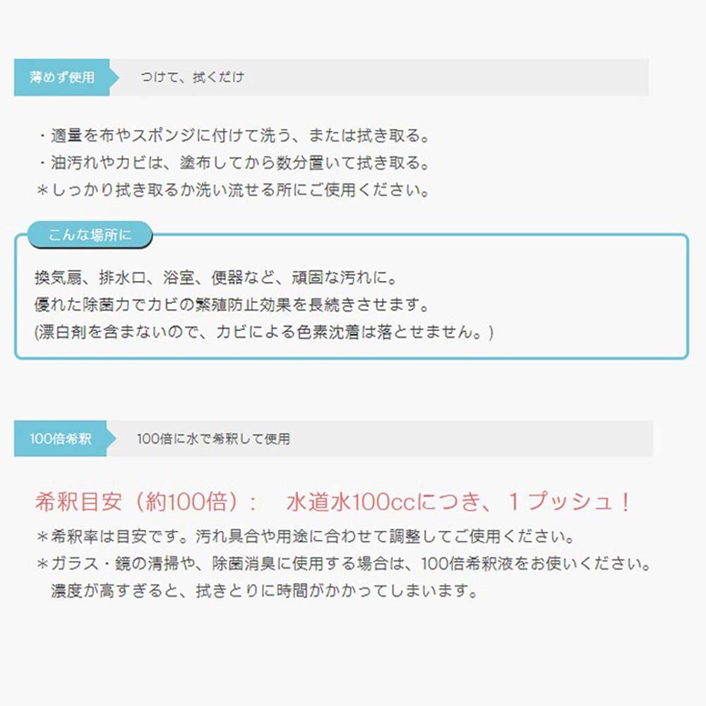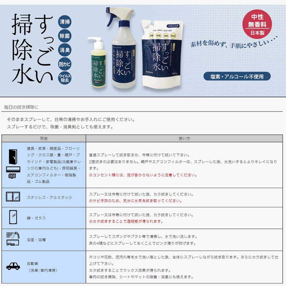 広告文責・販売事業者名:株式会社ビューティーサイエンスTEL 050-5536-7827商品名 すっごい掃除水 濃縮タイプ 150mL 内容量 150mL 商品詳細 塩素やアルコールを含まない「すっごい掃除水」は、体についても大丈夫! お風呂上がりに浴室の天上や床の4隅にスプレーでシュッ! しておけば防カビ対策もできちゃいます。 使用箇所を選ばずに、洗浄、除菌、消臭、防カビ、さらにはウイルス対策までできる「すっごい掃除水」。 ●かんたんキレイ、家中あれこれいろいろ使える! ●プロ仕様、ホテルやデイサービスでも選ばれる! ●中性、無香料、塩素不使用 ●清掃、消臭、除菌、防カビ ●100倍に薄めて使う濃縮タイプ 成分 界面活性剤(10.3% :ポリオキシエチレンアルキルエーテル・ポリオクチルポリアミノエチルグリシン) 使用方法 ・換気扇、排水口、浴室、便器など、しっかり拭き取るか洗い流せる所の頑固な汚れにご使用ください。 ・漂白剤を含まないので、カビに対する見た目の即効性は劣りますが、優れた除菌力がカビ繁殖防止効果を長続きさせます。 ・適量を布やスポンジに付けて洗う、または拭き取る。油汚れやカビは塗布して数分置いてから拭き取る。 市販のスプレーボトルなどに希釈液を入れて、拭き掃除や除菌、消臭用にご使用ください。 ・家具、調度品、フローリング、畳、壁面、トイレ、浴室、鏡ガラス、自動車、ステンレス製品、プラスチック製品などの洗浄。 ・トイレ、生ごみ、ペット周り、靴、ソファ、マットレス、寝具等の除菌消臭。 ・直接スプレーして拭き取る、または洗う。布、スポンジ、モップ等に付けて拭く。ガラス・鏡、自動車はカラ拭きして仕上げる。臭いの元に噴射する。 ・対象面1平方メートルに対して100倍希釈液を4-5回噴射。または、布やスポンジに4-5回噴射して拭く。臭いの元には100倍希釈液を4-5回噴射。 ※希釈目安:水100ccにつき、本品1押しを入れてください。 注意事項 ●用途以外に使わないでください。 ●子供の手の届く所に置かないでください。 ●直射日光の当たる場所や高温多湿の場所で保管しないでください。 (分離・混濁や変色・臭いを生じたりすることがあります。) ●目に入らないように注意してください。 ●劣化して傷んだ塗装面、真珠・珊瑚・べっ甲・オパールなどには使用しないでください。 ●水洗い不可の表示があるもの、絹・ウール・毛皮など、または、淡い色のものに使用する場合は、 事前に目立たないところで確認してください。 ●汚れが残っている箇所に使用すると輪染みを生じることがあります。 ●すべての菌を除菌するわけではありません。。 ・目に入った場合はこすらずに流水で洗い流す。 ・飲み込んだ場合は吐かずに口をすすぎ水を飲む等の処置をして医師に相談する。 備考 ※効果には個人差があります。 すべての方に効果を保証するものではありません。 ※パッケージデザイン等は予告なく変更されることがあります。 ※メーカー都合により商品のリニューアル・変更及び原産国の変更がある場合があります。 区分 日用品 製造国・原産国 日本 発売元・販売元 ガナ・ジャパン株式会社 JANコード 4562476520124