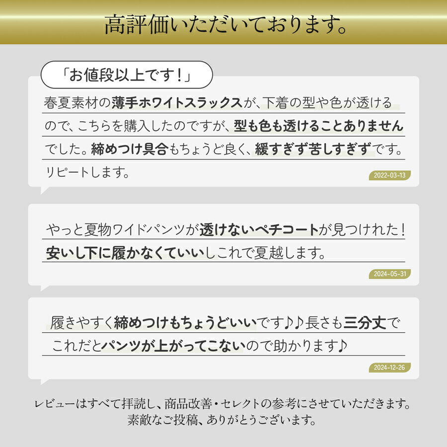 「ぴっちり。」タイト設計ペチコートパンツ|3分丈|一部シームレス&ハイウエスト|白パンツでも透けないタイト設計│静電気防止 綿混 「白パンツでも、もう怖くない。」ぴったり密着×透け対策ペチコートパンツ。 「白パンツが透ける」「ラインが浮く」「ゆるめのペチコートでは満足できない。」そんな悩みに応える、“ぴったり密着&かさばらない”タイト設計の3分丈ペチパンツ。 タイトスカートのためのペチコートではなく、体にぴったり沿うインナーを求める方におすすめ。 白パンツやスカートでも透けにくく、下着のラインも目立ちにくい一部シームレス仕様。 お腹まわりは裏地付きの二重構造で、冷房の冷えからやさしくガード。 太もも部分は一重仕様で通気性に優れており、ムレを防ぎ、暑い日も快適な履き心地をキープします。 クロッチ部分は綿100%で通気性も良く、ムレにくく快適。 さらっとした薄手素材&冬場は摩擦による静電気を防ぎ、オールシーズン活躍します。 締め付けすぎない程よいホールド感で、日常使いにもぴったりなストレスフリーインナーです。 関連キーワード: タイトペチコート ぴっちりペチパンツ ベージュ ホワイト ぴったりフィット 冷房対策 冷え対策 腹巻き お腹冷え防止 スカートに響かない 張り付かないインナー タイトな履き心地 パンツ下インナー 体に沿うインナー ピッタリ密着 ペチパンツ 3分丈 レディース インナー ハイウエスト シームレス クロッチ綿100 透け防止 白パンツ 透けない 白パンツ対応 下着ライン対策 ストレスフリー 通気性 吸汗速乾 静電気防止 オーバーパンツ ガードル代わり サラサラ 快適 春 夏 秋 冬 ●サイズ サイズ 着丈 ウエスト ヒップ もも周り 股上 股下 裾幅 M 32cm 27cm 29cm 32cm 24cm 8cm 14cm L 33cm 28cm 30cm 32cm 24cm 9cm 15cm XL 34cm 31cm 31cm 34cm 25cm 11cm 17cm ※サイズは平置き、メジャー採寸を行っております。 実寸は商品によって若干の誤差が生じる場合がございます。予めご了承ください。 ●商品詳細 1.透け防止&安心の3分丈設計 薄手ボトムスでも透けにくく、下着のラインも見えにくい安心構造。 丈はやや短めで裾も出にくく、動いてもめくれにくい設計です。 2.白パンツにも安心な透け防止設計 下着のラインや色が浮きにくく、自然な仕上がりに。 3.他の「ふんわり系ペチコート」とは違う、ぴったり密着型のタイト設計。 「タイトスカートに合わせる」ではなく、「タイトな履き心地」を求める方へ。 4.一部シームレス仕様でアウターに響きにくい 縫い目を最小限に抑えた一部シームレス設計。 タイトなスカートやパンツの下でもラインが目立ちにくく、スッキリとしたシルエットに。 5.ハイウエスト設計でしっかりフィット お腹までしっかり包み込むハイウエストタイプ。 ズレにくい安心感に加え、冷房によるお腹まわりの冷え対策にも◎。 ほどよいフィット感で、一日中快適な履き心地をキープします。 6.生地構造にも工夫 上部1/3は裏地付きでお腹を冷えから守る二重構造。 下部2/3は軽やかな薄手素材で通気性抜群。季節を問わず快適に過ごせます。 7.クロッチ部分は綿100%でムレにくい デリケートゾーンには綿100%素材を採用。 汗をかきやすい季節でもさらっと快適。1枚履きも安心です。 ※淡色は透けやすいため、ペチコートとしてご利用いただく場合はインナーと重ねて履くことを推奨しております。 8.薄手&なめらかな肌ざわり 軽量かつ薄手でなめらか。肌に吸いつくような着用感で、ストレスフリーに過ごせます。 伸縮性にも優れており、体の動きにしっかりフィットします。 9.まとわりにくいから静電気防止に 冬場はニットの摩擦で静電気が発生しやすく、地味にストレス。一枚仕込んでおくことで、スカートやワンピースにまとわりにくく、季節問わず快適に使えます。 〇イチオシポイント ・ 一部シームレス仕様: アウターに響かずラインが出にくい ・ 透け防止設計: 白パンツやスカートの下に最適な3分丈 ・ ハイウエスト設計: 冷房冷え対策にも◎ ズレにくく快適なフィット感 ・ クロッチ部分は綿100%: 通気性が良く長時間の着用でも快適 ・ 薄手&なめらか素材: 伸縮性のある軽やかな生地でストレスフリー ・ 静電気防止: まとわりつかず快適な着心地を実現 ・上下で異なる生地構造: お腹は裏地付きで冷え対策、脚まわりは通気性◎の一重仕様 〇こんな方に! ・ 下着ラインを気にせずパンツ・スカートを履きたい方 ・ ふんわり系ではなく、ぴったりした履き心地が好みの方 ・ 蒸れにくく快適なインナーを探している方 ・ 着回しできる薄手インナーをお探しの方 〇カラーバリエーション ブラック / ベージュ / ホワイト 肌なじみのよい3色展開で、スタイルやシーンに合わせて選べます。 〇デザイン 【一部シームレス構造】 ラインが出にくく、アウターに響かない設計 【3分丈&ハイウエスト】 裾から見えにくく、お腹周りをやさしくホールド 〇素材綿スパンデックス※海外輸入品のため素材の基準が日本と異なる場合がございま