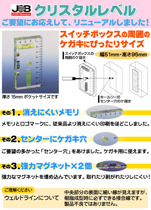 マーベル/MARVEL クリスタルレベル JBL-100MX スイッチボックスのケガキ作業に 消えにくい目盛、目盛とロゴマークに、従来品より消えにくい印刷をほどこしました。 センターにケ描き穴、ご要望の多かった「センター穴」をあけました。 ケ描き用に使えます。 強力マグネット×2個(埋込み) ※ウェルドラインについて:中央部分の表面に細い線が見えますが、樹脂成型時に必ずできる接合線ですので、製品不良ではございません。 仕様 サイズW51×H95×D15mm 質量95g JAN4992456503531
