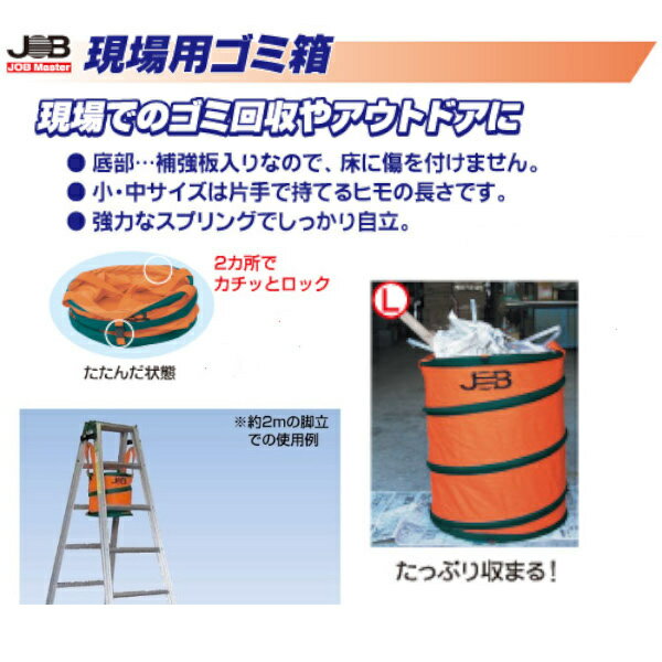 ジョブマスター JGB-L 現場用ゴミ箱 L現場でのゴミ回収やアウトドアに。●どこでも持ち運べるパーソナルな感覚のゴミ箱。●底部は補強板入りなので、床に傷を付けない。●強力なスプリングでしっかりと自立する。●2カ所でカチッとロック。※縫製品のためサイズが若干異なることがございます。 タイプバリエーション 現場用ゴミ箱 SS JGB-SS 現場用ゴミ箱 S JGB-S 現場用ゴミ箱 M JGB-M 現場用ゴミ箱 L JGB-L 現場用ゴミ箱 S フタ付JGB-SF 現場用ゴミ箱 M フタ付JGB-MF 仕様サイズ直径580×伸長時695・たたみ150mm素材ポリエステル、銅鉄線質量3100g※当店に在庫のない場合はお取り寄せのため納期にお時間がかかる場合があります。送料無料対象外地域あり