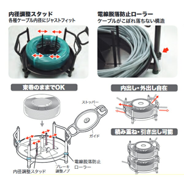 Jefcom ジェフコム DENSAN デンサン マルチケーブルリール VB-4500各種ケーブルを収納引出し可能な理想のケーブルリール●内径調整スタット VAだけでなく各種ケーブルにジャストフィット●電線脱落防止ローラー●すべり止め用 ゴム脚付(段積可)●よく回るが、勢いよく回してもブレーキが利いて回りすぎないので使いやすい●束巻のまま置くだけでセット完了●ケーブル2.6×3Cまで収納OK●ブレーキ付(強弱調整可能)●内出し・外出しOK※ケーブルは付属しておりません仕様本体サイズ直径φ460×幅500×高さ243mm質量8kg収納最大荷重0.39kN(40kgf)最大積段数4段※当店に在庫のない場合はお取り寄せのため納期にお時間がかかる場合があります。送料無料対象外地域あり