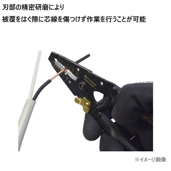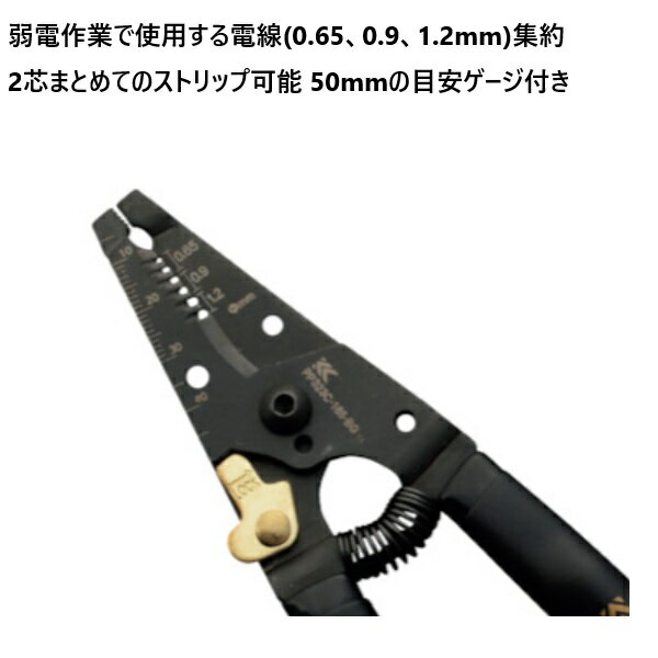 FUJIYA フジ矢 ワイヤーストリッパ C型 黒金 KUROKIN PP323C-165-BGインターフォン・火災報知器等の弱電作業に最適!●刃部の精密研磨により被覆をはぐ際に芯線を傷つけることなく、高い精度で作業を行うことが可能●インターフォン・火災報知器等の弱電作業に最適●弱電作業で主に使用する電線3サイズ(0.65、0.9、1.2mm)を集約、2芯まとめてのストリップが可能●50mmの便利な目安ゲージ付き●刃元部分で銅線など線材の切断が可能●注意事項・本来の目的以外、能力以上の使用、電気の流れている物への使用は絶対しないで下さい。感電の恐れがあります。・作業中は周りの安全を確かめ、保護眼鏡等を着用のうえご使用ください。仕様全長167mm適合電線 mm単線φ0.65/0.9/1.2材質特殊鋼質量120g※当店に在庫のない場合はお取り寄せのため納期にお時間がかかる場合があります。