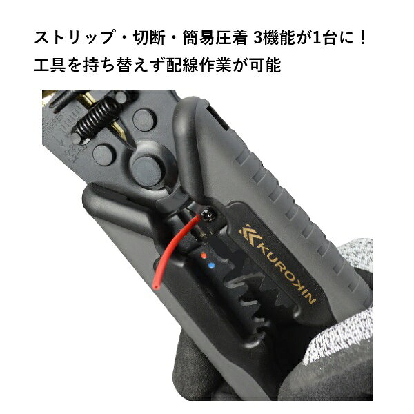 FUJIYA フジ矢 オートマルチストリッパ 黒金 KUROKIN PP717A-220-BGストリップ・切断・簡易圧着の3機能が1台に!!●ワイヤーを差し込みグリップを握るだけで調節せずに簡単にストリップ作業が可能●スピーカー線などは2本同時に剥くことも可能※ストリップ時に被覆が滑る場合はノブをプラスに回して調整下さい●中の線に傷がつく場合はノブをマイナスに回して調整をして下さい●ストリップ・切断・簡易圧着の3機能が1台に入っているため、工具を持ち替えずに機械・自動車・電気器具などの配線作業が可能●注意事項・本来の目的以外、能力以上の使用、電気の流れている物への使用は絶対しないで下さい。感電の恐れがあります。・作業中は周りの安全を確かめ、保護眼鏡等を着用のうえご使用下さい。仕様仕様バネ付き全長 mm205材質特殊鋼質量353g※当店に在庫のない場合はお取り寄せのため納期にお時間がかかる場合があります。送料無料対象外地域あり
