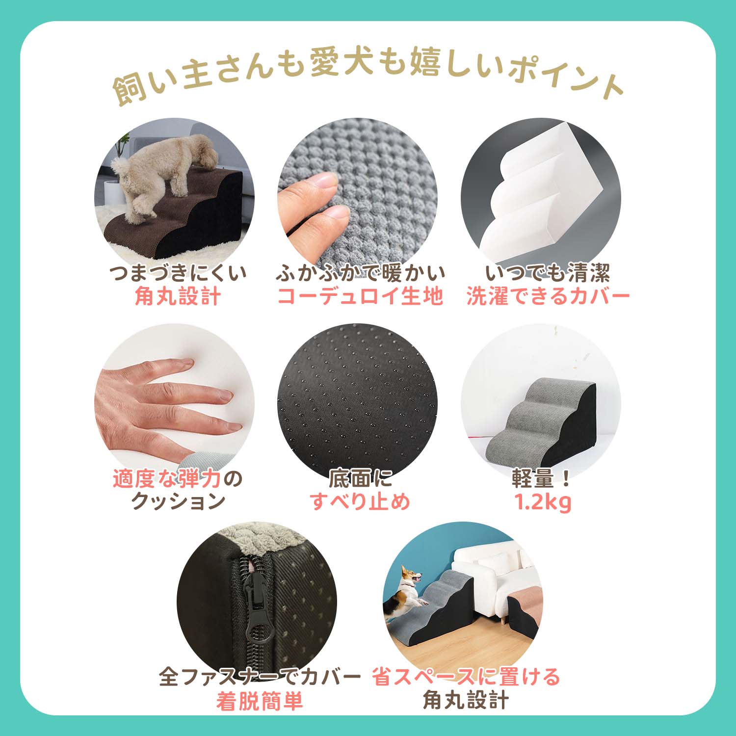 愛犬の階段革命!なだらかドッグステップ ~毎日の昇り降りが楽しくなる秘密~ 愛犬が自ら進んで使いたくなる7大特徴 獣医師も推奨する階段角度 12度の最適な傾斜設計で、関節への負担を軽減 段ごとに10~15cmの微調整が可能 足を上げる動作が自然にできる特殊形状 まるで雲の上のふかふか感 高密度クッションが衝撃を吸収 コーデュロイ生地の立体凹凸がマッサージ効果 冬は暖かく、夏は通気性抜群 洗えるから365日清潔キープ ファスナー1つで簡単着脱 洗濯機で丸洗い可能(ネット推奨) 速乾性に優れた特殊素材 どんな床でもビタっと固定 底面に特殊ゴム製滑り止め 重量1.2kgなのに安定感抜群 フローリング・畳・カーペット対応 飼い主さんにうれしい配慮 角丸設計でつまずき防止 軽量で収納ラクラク おしゃれな2色展開 愛犬の安全を徹底追求 耐荷重50kgの頑丈構造 滑りにくい凹凸加工 自然な姿勢を保つ段差設計 成長に合わせて長く使える 子犬期からシニア期まで 体調変化に合わせて段数を選択 カバーだけの買い替えも可能 ワンちゃんのタイプ別おすすめ活用法 ■ 元気いっぱいの子犬さん → 2段タイプで階段の練習スタート ■ お利口さんの成犬ちゃん → 3段タイプで毎日快適に ■ ゆっくり過ごすシニアちゃん → 4段タイプで優しくサポート お客様の感動の声が続々! "12歳のダックスが自分から階段を使うようになりました!以前は抱き上げないとベッドに上がれなかったのに..." "洗濯できるのが本当に助かります。愛犬のアレルギー対策にも最適です" "軽いのにしっかりしていて、デザインもおしゃれ。リビングに置いても違和感ありません" 商品詳細スペック サイズバリエーション ・2段:幅40×奥行30×高さ30cm ・3段:幅40×奥行35×高さ35cm ・4段:幅40×奥行45×高さ45cm カラーバリエーション ・ナチュラルグレー ・クラシックブラウン愛犬の階段革命!なだらかドッグステップ ~毎日の昇り降りが楽しくなる秘密~ 愛犬が自ら進んで使いたくなる7大特徴 獣医師も推奨する階段角度 12度の最適な傾斜設計で、関節への負担を軽減 段ごとに10~15cmの微調整が可能 足を上げる動作が自然にできる特殊形状 まるで雲の上のふかふか感 高密度クッションが衝撃を吸収 コーデュロイ生地の立体凹凸がマッサージ効果 冬は暖かく、夏は通気性抜群 洗えるから365日清潔キープ ファスナー1つで簡単着脱 洗濯機で丸洗い可能(ネット推奨) 速乾性に優れた特殊素材 どんな床でもビタっと固定 底面に特殊ゴム製滑り止め 重量1.2kgなのに安定感抜群 フローリング・畳・カーペット対応 飼い主さんにうれしい配慮 角丸設計でつまずき防止 軽量で収納ラクラク おしゃれな2色展開 愛犬の安全を徹底追求 耐荷重50kgの頑丈構造 滑りにくい凹凸加工 自然な姿勢を保つ段差設計 成長に合わせて長く使える 子犬期からシニア期まで 体調変化に合わせて段数を選択 カバーだけの買い替えも可能 ワンちゃんのタイプ別おすすめ活用法 ■ 元気いっぱいの子犬さん → 2段タイプで階段の練習スタート ■ お利口さんの成犬ちゃん → 3段タイプで毎日快適に ■ ゆっくり過ごすシニアちゃん → 4段タイプで優しくサポート お客様の感動の声が続々! "12歳のダックスが自分から階段を使うようになりました!以前は抱き上げないとベッドに上がれなかったのに..." "洗濯できるのが本当に助かります。愛犬のアレルギー対策にも最適です" "軽いのにしっかりしていて、デザインもおしゃれ。リビングに置いても違和感ありません" 商品詳細スペック サイズバリエーション ・2段:幅40×奥行30×高さ30cm ・3段:幅40×奥行35×高さ35cm ・4段:幅40×奥行45×高さ45cm カラーバリエーション ・ナチュラルグレー ・クラシックブラウン