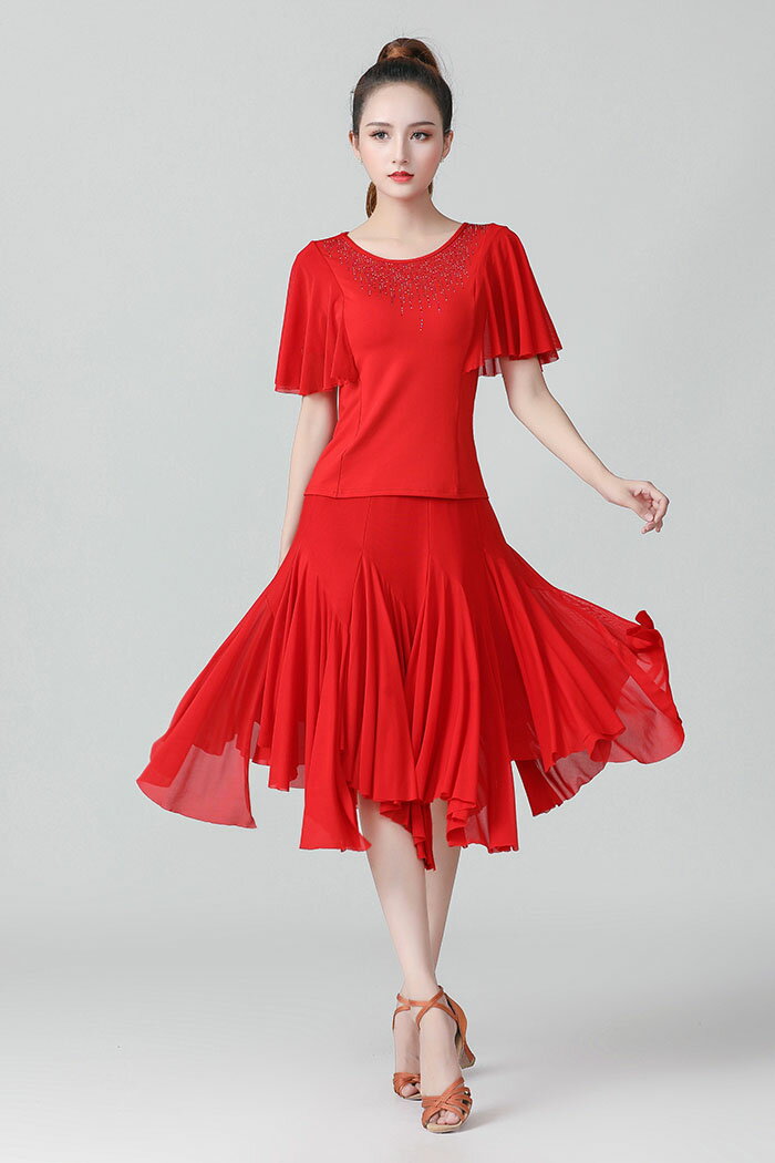 社交ダンス 衣装 レディース モダンダンス ダンス衣装 セットアップ 半袖トップス 裾広がるスカート 2点セット 社交 ダンス練習着 モダンダンス コーラス衣装 ダンスウェア レッスンウェア ダンス衣装 ステージ衣装 舞台衣装 合唱 団体 演奏会 発表会 パーティー イベント