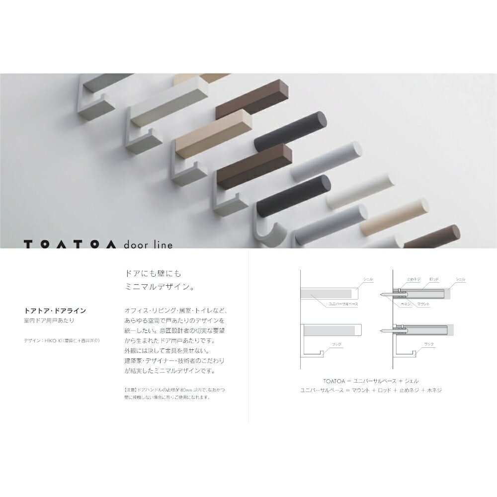 【SKB TOATOA ドアラインC3】 現代のインテリア空間への調和をめざした室内木ドア用戸あたり。 空間を選ばない汎用的なデザインです。 外観には決して金具を見せない、建築家・デザイナー・技術者のこだわりが結実したミニマルだけど、やさしいフォルム。 ミニマルだけど、やさしいフォルム。空間を選ばない汎用的なデザインです。 サイズ:L90×H20×W20mm 材質:合成ゴム、鉄 色:ブラック・グレー・ホワイト・カフェオレ・チョコレート(選択要) 付属品:固定用木ねじ、止めねじ、六角レンチ付 入数:1個 ●他、取扱のTOATOAシリーズはこちら 戸当り シンプル クッション ゴム 壁 ドア ストッパー おしゃれ 戸当たり diy パッキン ゴム 扉豊富なラインナップの「選べる戸あたり」。