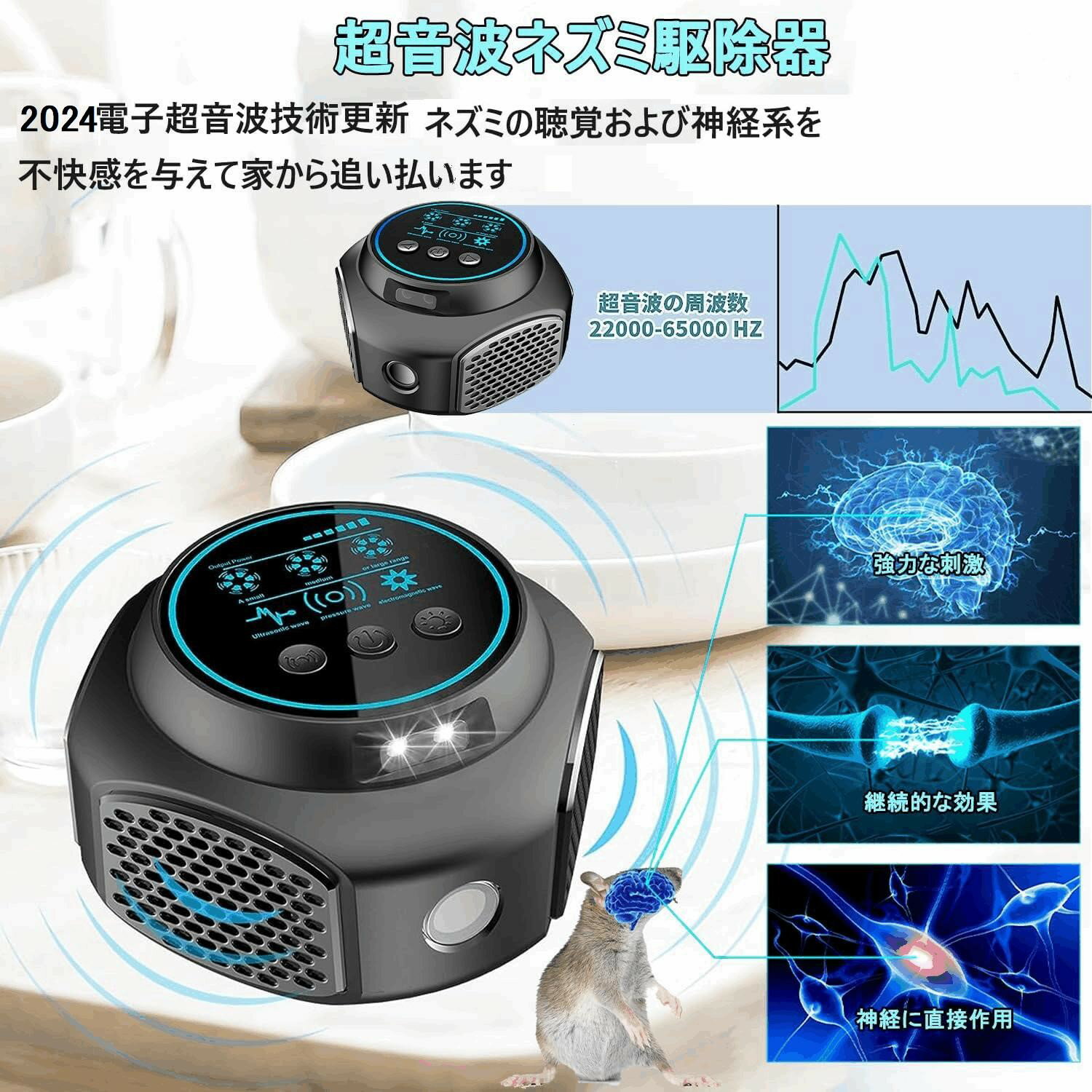 超音波ネズミ駆除器 360度 V2強化 2025年最新 静音モード搭載 広範囲 連続稼働 省エネ 電池不要 非電池式 usb式 TypeC ネズミ撃退 ねずみ忌避 害虫駆除 電動虫除け ネズミ退治 非殺傷 子どもやペット安心 リビング トイレ バス キッチン 厨房 屋根裏 ガレージ 倉庫 害虫齧歯類 ゴキブリ ムカデ クモ ダニノミ コウモリ 蚊 蠅 (ネズミ捕り/ネズミシート/薬剤/薬品不要) 安心安全 駆除装置 【超音波駆除器バージョン2(第二世代)**超音波ネズミ駆除器 360度対応 最新版】**【パッケージ内容】超音波駆除本体*1専用Type-C USBケーブル*1日英説明書*1【その他注意事項】・USB-ACアダプターは含まれておりません。コンセントでご利用の際は、スマホ充電用等でございます「5V/1A規格」のUSB-ACアダプタを別途ご用意ください。・上記規格以外のケーブルやアダプターなどを使用しないで下さい。故障の原因になります。・閲覧環境により色合い等が異なって見える場合があります。・使用当初混乱するネズミに出くわす確率が一時的に高くなる場合がございます、正常な現象です。掃除を十分に行い飲み水や食べ物などを絶ち継続使用ください。・機械スピーカー仕様により多少動作音などがでる場合がございますが正常となります。最も強いモードは大きな音がします。また静音の超音波でも敏感な方などは聞こえる場合があります、周りの迷惑にならないようご注意ください。・効果を100%を保証するものではございません。聴覚障害や性格などの個体により十分できない場合もあります。また、設置場所(80cm〜推奨)や周辺壁・鉄骨といった障害等環境によって広がりに差がある場合があります。超音波が十分に広がる場所へ設置を検討し、徹底した清掃・衛生といった基本的対策やその他対策法を併せて行う事で相乗効果がえられます。・本品は屋内家庭用で防水ではありませんので外での使用や水濡れをお避け下さい。【小型多機能駆除器・設置簡単】手のひらサイズのコンパクトデザインで場所を取らずコンセントにさしこむだけで設置もすぐにでき電池交換などの手間も省けます。ネズミ害虫の嫌がる超音波周波数がネズミや害虫の神経に働きかけ撃退します。ネズミはもちろんのこと、リス、ゴキブリ、コウモリ、ノミ、蚊、ハエ、クモ、ムカデ、ナンキンムシ、蛾など様々な害虫害獣に有効です。【化学薬品&死骸フリー・衛生的でエコ&省エネ】化学物質によるネズミ駆除とは異なり超音波駆除器は毒薬などを使用せず超音波によって忌避し退治するので、ネズミ捕りや粘着式、毒などのように死骸がでず、誤飲の心配がありません。大切なお子様やペットがいても安全に使用できますので、薬剤などを使用できない環境でのネズミ駆除に最適な選択です。(齧歯類や昆虫類のペットには使用しないでください。)【連続稼働・360°広範囲カバー・選べる静音モード、周囲360度】超音波周波数22000〜65000Hz&四方に向けられた超音波スピーカーによる広有効範囲+周波数にバージョンアップした本製品は、切り替えもワンボタン操作で簡単です。状況に応じて慣れを防ぎつつ様々な対象に適応できます。(超音波は障害物がたくさんあるとさえぎられてしまいますので、広いフロアや障害物がある場所には複数台の設置や設置場所に障害物を避けて高低差をつけるなどを推奨します。)【幅広い利用シーン】屋内、お部屋、事務所、オフィス、業務用、家庭用、キッチン、厨房、台所、リビング、飲食、ロフト、屋根、天井裏、網戸、古い民家、食器棚、ガレージ、車庫など幅広いケースで使用可能です。【アフターサービス】万一初期不具合などでお困りの際には、「購入履歴」の「ショップへ問い合わせ」ボタンからお気軽にお問い合わせください。【使用方法】1.設置場所を決めます。周辺や対象エリアに障害物ができるだけ少ない場所に地面より約80cm離して設置してください。環境に応じて設置場所を工夫してください。2.ケーブルを繋げます。本体裏のしっかりと刺さっていることを確認してください。(USBケーブルを使用の場合、規格に対応したケーブルやUSB-ACアダプタを別途ご用意下さい。)3.上のボタンを押してオンにして開始します。また押すごとにモード変更ができます。状況やお好みに合わせてご使用ください。【使用経過のイメージ】3〜5日:超音波によりネズミの生活環境が住みづらくなり巣から逃げ出してきて動きが活発になります。その為一時的にネズミに遭遇するチャンスが増えますが続けて使用します。また、使用開始と同時に、環境をきれいに清掃して、餌となるような生ごみ、木の実、排水、汚水などを除去し総合的対策をお勧めします。1〜2週:神経系統にストレスが与えられノイローゼ気味になります。食べ物や飲み水が見つけられなければ別の居住環境へ移り始めます。4〜5週:ほとんどのネズミは生理的心理的に完全に住みづらくなった悪環境から脱出します。逃げ延びることができなかったネズミも無気力になって食欲繁