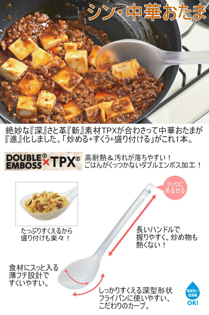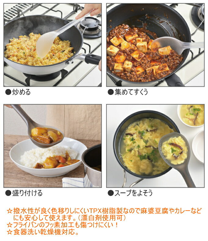 商品詳細 サイズ (約)83×303×46mm、45g 材質 ポリメチルペンテン(耐熱温度180℃/耐冷温度-30℃) 原産国 日本 特徴 フライパン用として進化した「中華おたま」です。 「炒める+すくう+盛り付ける」がこれ1本! たっぷりすくえる深いカップ形状なので、チャーハンなどの炒め物はもちろんスープなどの汁物にも使えます。 長いハンドル、極薄のフチ、フライパンにフィットする形状など、使いやすさをとことん追求。 撥水性が良く色移りしにくいTPX樹脂製なので麻婆豆腐やカレーなどにも安心して使えます。(漂白剤使用可) フライパンのフッ素加工も傷つけにくい! 食器洗い乾燥機対応。