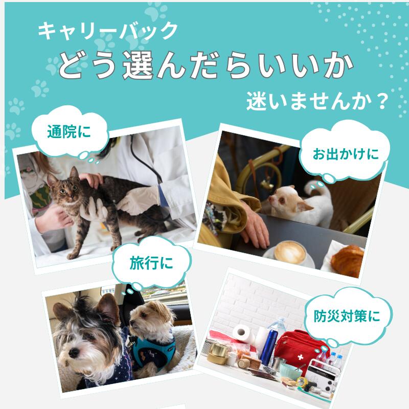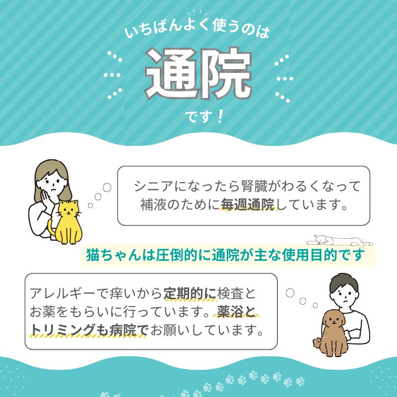商品名称 ペットリュック ペットキャリー リュック キャリーバック 猫 ネコ 犬 ペット 病院 通院 お出かけ 旅行 軽量 補強 底板 折り畳み 防災 通気性 10kgまで 北欧 携帯水飲み 特典付き キャッチコピー ゆったり くつろげる ワイド設計 リュック キャリーバック 通院 快適 ネコ 猫 犬 小型犬 10kg 北欧 おしゃれ 色 グリーン、パープル、ネイビー サイズ 横の長さ 40cm,奥行き 25cm、高さ 38cm 商品特長 こだわりポイント●フセでくつろげる横長タイプ。拡張なしでもゆったりなワイド設計。●一番出番の多い通院での快適さを追求。子犬子猫、シニア犬猫にとって「居心地の良さ」を大切にしました。●通気性を重視し、6つの通気孔とメッシュ窓が3面すべてに。側面のメッシュ窓はロールアップ出来ます。●正面のメッシュ窓からいつでも中の様子を見ることが出来ます。中にいるペットも飼い主様の気配を感じるから安心感が伝わります。●飼い主様の使いやすさもとことん追求。背中のあたりはメッシュで快適、リュックを置いても汚れない底当て付き。携帯や診察券もサッとしまえる大きなポケット、リュックの重さを安定させるための胸ストラップも付いています。●安全性にもこだわり。中から開かないロックジッパーを採用。飛び出し防止リード付き。特典付き!【おりたたみ水飲み&カラナビ】●お水は自販機で買えるけれど飲ませる容器がない!って時ありますよね。年々気温上昇で熱中症対策にも飲水は大切。カラナビで吊るせる折り畳み水飲みを特典で付けました。防災対策としてもお使い頂けます。リュックに合わせてグレー色をお届けします【特注!国産鞄専用補強底板】●リバーシブルの底板が付いていますが、いごこちの良さは安定性にあります。もう少し底板を補強したいというリクエストにお答えして、人間用の鞄用底板に使われる、薄くて柔軟性がある専用底板を特注しました。この底板でたわみが完全に無くなるわけではありませんが、段ボールやプラダンをカットしていれるよりも軽量で柔軟性があるので、リュックの生地を傷めません。また薄いので中の高さに影響しません! 注意事項 ●使用前はファスナーの破損、メッシュの破れがないかなど安全面を確かめてご使用ください。メッシュ部分は耐久性の高い素材を使用していますが、歯の生え変わる前に子犬や噛み癖のある犬が破壊する場合があります。破損の場合にはすぐに使用を中止してください。 ※モニター発色の具合により色合いが異なって見える場合がございます。