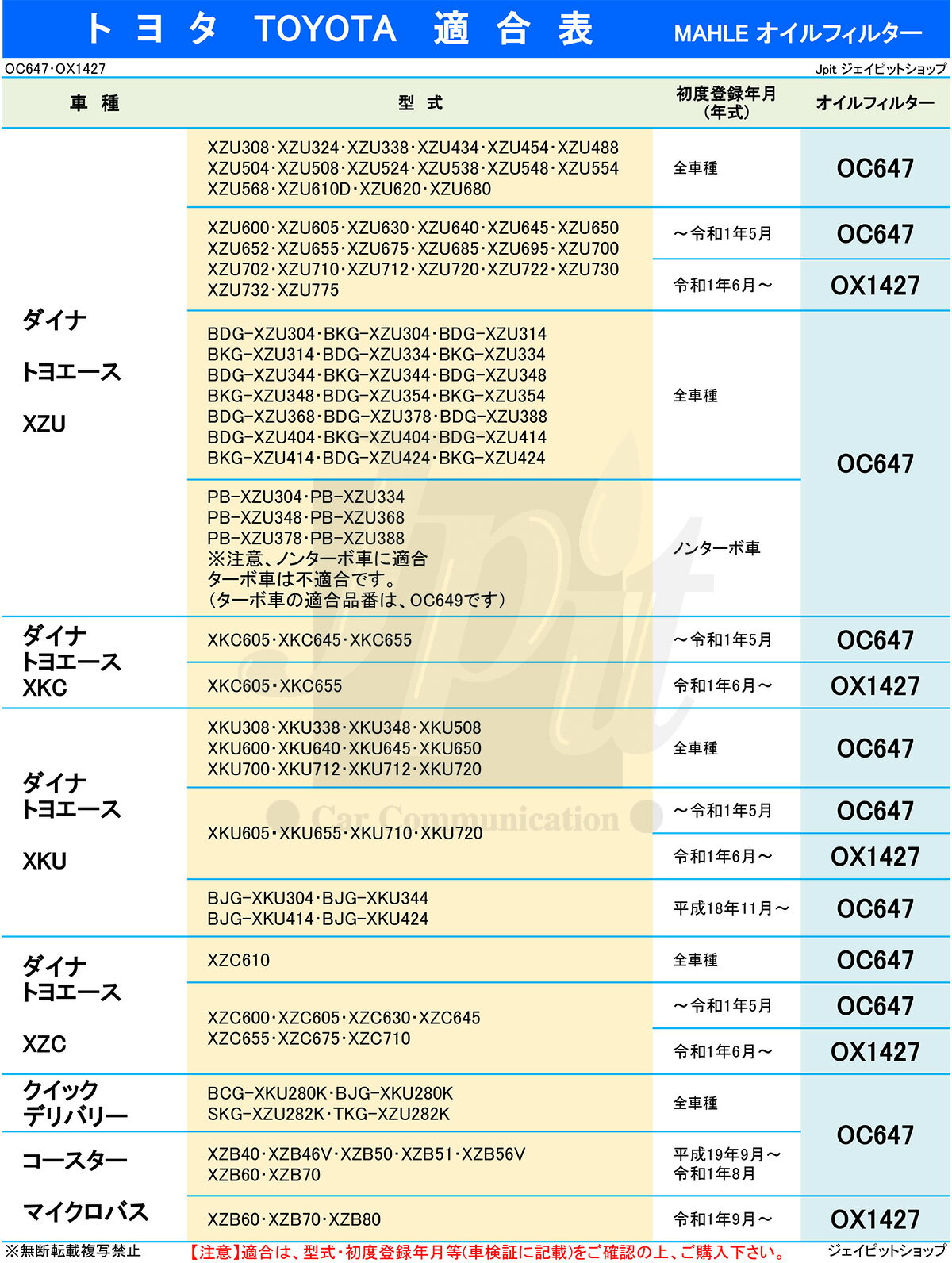 【ブランド】 MAHLE マーレ 『MAHLE マーレ』は、純正フィルター供給世界NO.1フィルターメーカー! MAHLEは世界最大級の純正サプライヤーです。 【適合メーカー】 日野 ・ トヨタ 適合車種 ・ 日野 デュトロ/リエッセ マイクロバス ・ トヨタ トヨエース G25/ダイナ 200/コースター マイクロバス/クイック デリバリー 【注意】適合は、画像の適合表の型式等(車検証に記載)をご確認の上、ご購入ください。 【品番】OC647 【セット内容】オイルフィルターが2個 【フィルターサイズ】外径102mm 高さ149mm ネジ径1-12UNF 【適合フィルターレンチ】FR-102 【日野純正品番】 15607-2250/15607-2320/15613-E0080/15613-E0430/15613-E0431/15613-EV015/S1560-72250/S1560-72320/S1560-72390/S1560-72391 【トヨタ純正品番】 15613-78010/15613-78020/15613-78021/15613-89106/15613-E0080 ◇適合が見つからない場合や、ご不安やご不明な点などありましたら、お気軽にお問い合わせ下さい。 TEL 06-6335-7771【注意】適合は、画像の適合表の型式や初度登録等(車検証に記載)をご確認の上、ご購入ください。 ※適合が見つからない場合やご不明な点などありましたら、車検証の「車台番号」「型式」「初度登録年月」を必ず添えてお問合せ下さい。 TEL 06-6335-7771 【日野純正品番】 15607-2250/15607-2320/15613-E0080/15613-E0430/15613-E0431/15613-EV015/S1560-72250/S1560-72320/S1560-72390/S1560-72391 【トヨタ純正品番】 15613-78010/15613-78020/15613-78021/15613-89106/15613-E0080 【他社製互換品番】 TOYO:TO-H290/NITTO:4TP-133/EXCEL:HO-8012/マイクロ:T1645/PMC:PO-1573/VIC:C-608/アルプス:AO-529/ユニオン:C-163/ピーコック:PE-78013/エムカ:MO-88/WAKO:LO-6217K 『MAHLE マーレ』は、純正フィルター供給世界NO.1フィルターメーカー! MAHLEは世界最大級の純正サプライヤーです。 世界各国に生産拠点を構え、幅広い製品群で約100年間自動車業界に貢献してまいりました。 MAHLEは世界一の純正供給実績を誇り、全製品純正同等の品質で、世界各国に支持されております。 ◆最高品質のオイルフィルター(オイルエレメント) 『マーレ オイルフィルターの特徴』 ★汚染物質の混入を確実に防ぐ。 ★オイルグレードやエンジンの効率や性能を維持。 ★コールドスタート時の安定性を確保。 ★最大20バールのピーク負荷はハウジングの高圧抵抗によって相殺。 ★圧力リリーフバルブは、あらゆる条件下でオイルの供給を保証。 ★ノーリターンフローバルブはエンジンオフ時にフィルタの排出をストップ。 ★エンジンの始動時に適切なオイル供給を行います。