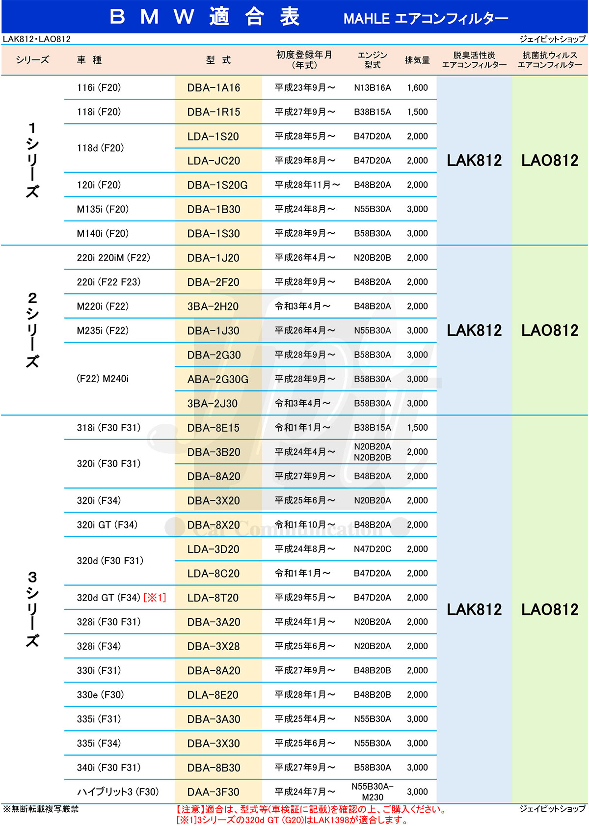 【ブランド】MAHLE (マーレ) 純正フィルター供給世界NO.1のフィルターメーカー! 【適合メーカー】 BMW ・ アルピナ 適合車種 ・ 1シリーズ ( F20 ) 116i 118i 118d 120i M135i ・ 2シリーズ ( F22 F23 ) 220i 220i M235i M220i M240i ・ 3シリーズ ( F30 F31 F34 ) 318i 320i 320iGT 320d 328i 330e 335i 340i アクティブハイブリット3 ・ 4シリーズ ( F32 F33 F36 ) 420i 428i 435i 440i ・ M2 ( F87 ) ・ M3 ( F80 ) ・ M4 ( F82 ) ・ アルピナ B3 B4 ( F30 F31 F32 F33 ) ビターボ Sビターボ ・ アルピナ D3 D4 ( F30 F31 ) ビターボ 【注意】適合は、画像の適合表の型式や初度登録年月等(車検証に記載)をご確認の上、ご購入ください。 【品番】LAK812 【商品名】活性炭エアコンフィルター タバコ・ペット・排ガス臭を消臭・脱臭、チリ・ホコリ・花粉・PM2.5の微粒子を除去 【交換方法】写真で図解!交換手順が箱の裏面に記載 【サイズ】縦248mm 横198mm 高さ40mm 問合せ先:ジェイピットショップ TEL 06-6335-7771『MAHLE (マーレ)』は、純正フィルター供給世界NO.1のフィルターメーカーオリジナルブランド! MAHLEは世界最大級の純正サプライヤーです。 世界各国に生産拠点を構え、幅広い製品群で約100年間自動車業界に貢献してまいりました。 MAHLEは世界一の純正供給実績を誇り、全製品純正同等の品質で、世界各国に支持されております。 【活性炭エアコンフィルターの特徴】 ★花粉・PM2.5や微粒子物質をシャットアウト! ★ちり・ほこりをシャットアウト! ★タバコ・ペット・排ガスの悪臭を遮断! ★排気ガス・オゾンなどの汚染物を除去! 【注意】適合は、画像の適合表の型式や初度登録年月等(車検証に記載)をご確認に上、ご購入ください。 ※適合が見つからない場合やご不明な点などありましたら、車検証の「車台番号」「型式」「初度登録年月(年式)」を必ず添えてお問合せ下さい。 TEL 06-6335-7771