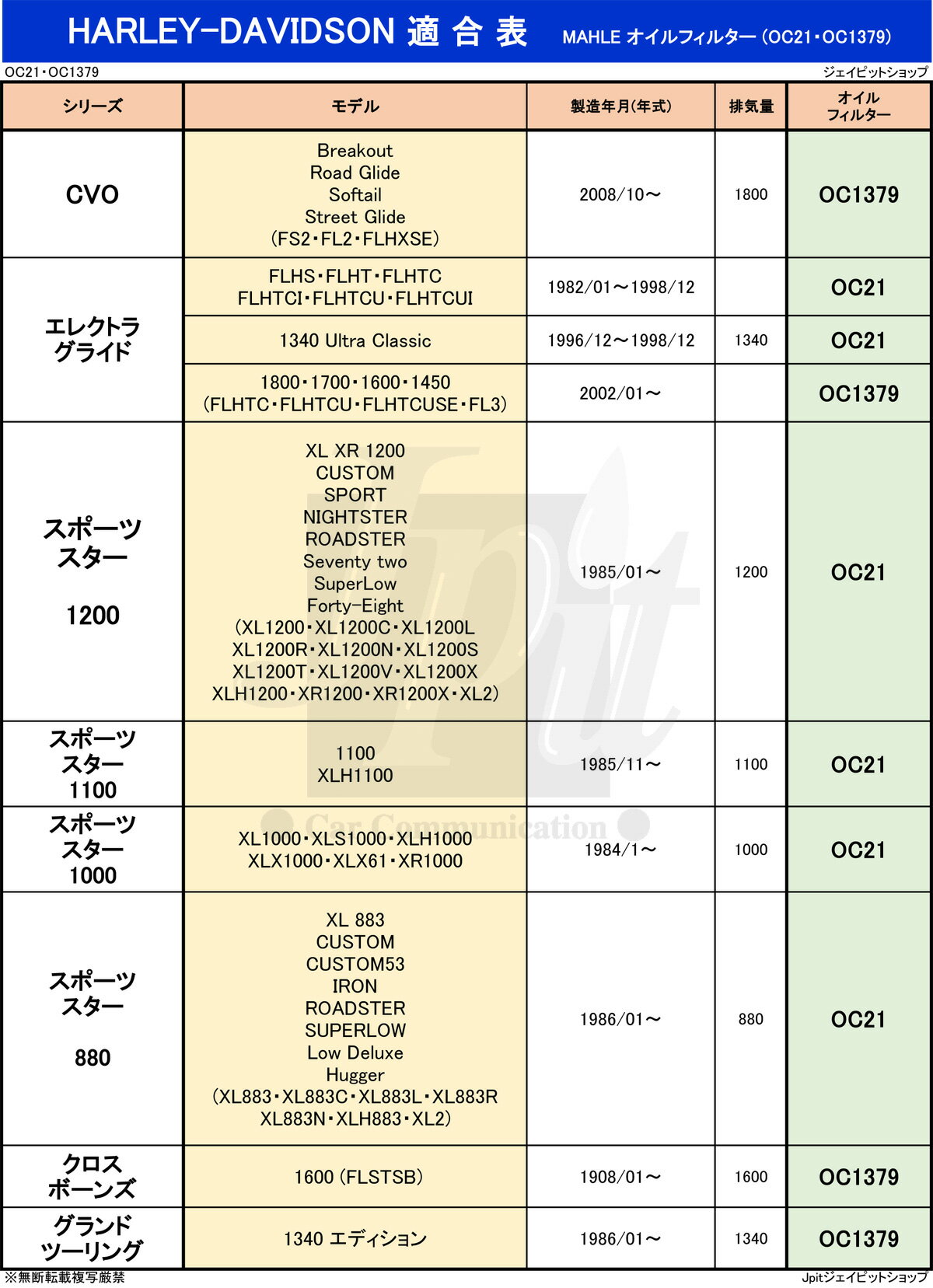 【ブランド】MAHLE (マーレ) 純正フィルター供給世界NO.1のフィルターメーカー! MAHLEは世界最大級の純正サプライヤー! 【適合メーカー】 ハーレーダビッドソン HARLEY-DAVIDSON 適合車種 ・ スポーツスター XL XR 1200 883 1100 1000 ・ ソフテイル エレクトラグライド スポーツグライド ・ ツアーグライドクラシック スーパーグライド ディスクグライド ・ ファットボーイ バットボーイ ヘリテイジ ・ ローグライド ローライダー ロードキング ロードスター 【注意】適合は、画像の適合表で車種や製造年月等(車検証に記載)を確認の上、ご購入ください。 【品番】OC21 【商品名】 オイルフィルター 5個セット 【セット内容】ハーレー用のオイルフィルター『OC21』が5個セットです。 【サイズ】高さ77.5mm 外径78mm ネジ径3/4"-16UNF 【純正品番】 6380580, 6380580A, 6380580T, 6380683, 6379677, 63796-77A 【適合レンチ品番】OCS1『MAHLE (マーレ)』は、純正フィルター供給世界NO.1のフィルターメーカーオリジナルブランド! MAHLEは世界最大級の純正サプライヤーです。 世界各国に生産拠点を構え、幅広い製品群で約100年間自動車業界に貢献してまいりました。 MAHLEは世界一の純正供給実績を誇り、全製品純正同等の品質で、世界各国に支持されております。 ◆最高品質のオイルフィルター(オイルエレメント) 『マーレ オイルフィルターの特徴』 ★汚染物質の混入を確実に防ぐ。 ★オイルグレードやエンジンの効率や性能を維持。 ★コールドスタート時の安定性を確保。 ★最大20バールのピーク負荷はハウジングの高圧抵抗によって相殺。 ★圧力リリーフバルブは、あらゆる条件下でオイルの供給を保証。 ★ノーリターンフローバルブはエンジンオフ時にフィルタの排出をストップ。 ★エンジンの始動時に適切なオイル供給を行います。 オイルフィルターが最大限の性能を発揮できるようにするためには、自動車メーカーが定めたサービス間隔内に交換する必要があります。 【注意】適合は、車種・年式等(製造年月)を確認の上、ご購入下さい。画像の適合表で確認できます。 ※適合が見つからない場合やご不明な点などありましたら、気軽にお問合せ下さい。 TEL 06-6335-7771