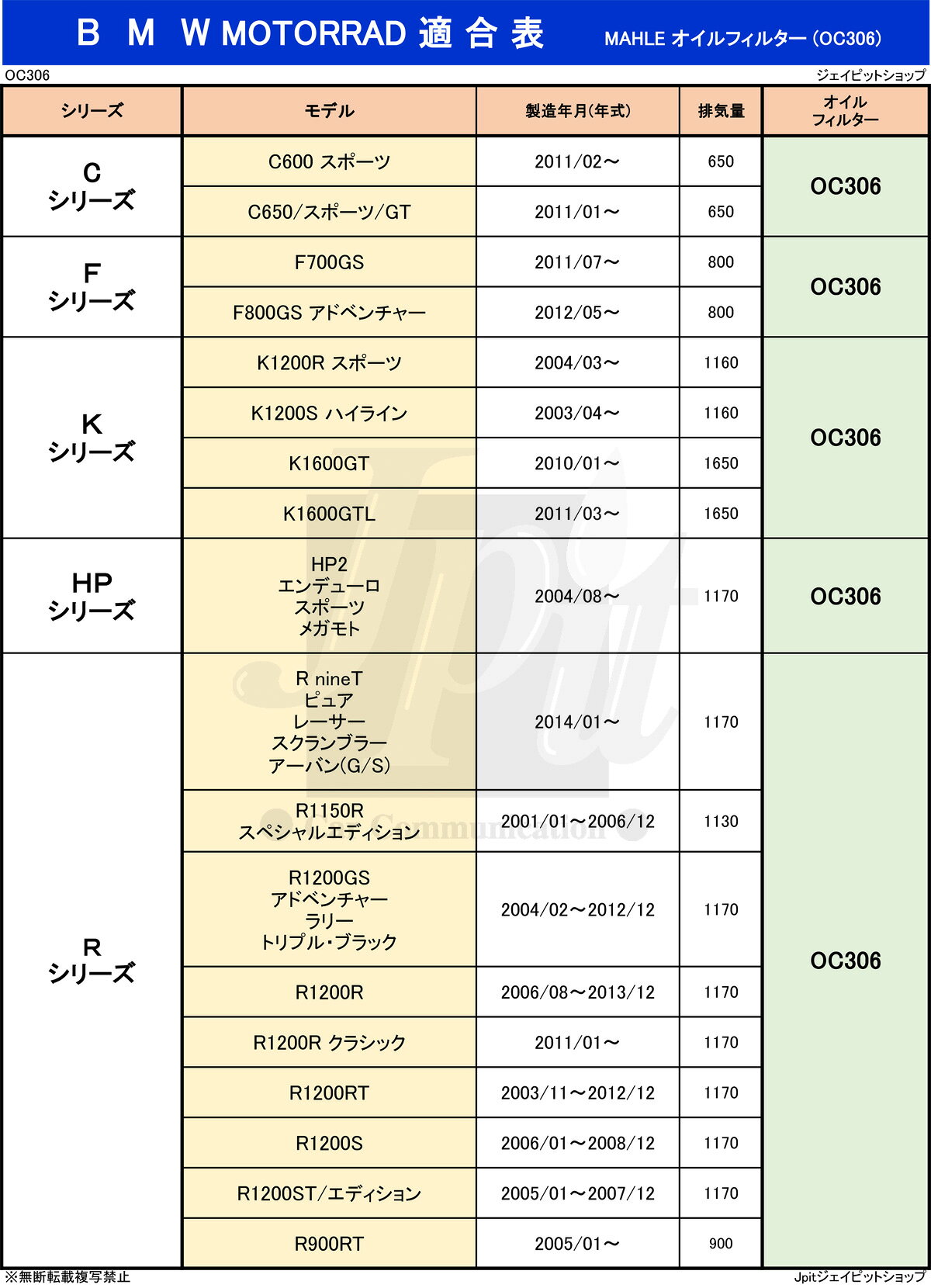 【ブランド】MAHLE (マーレ) 純正フィルター供給世界NO.1のフィルターメーカー! 【適合メーカー】 BMW MOTORRAD 適合車種 ・ Cシリーズ C600/スポーツ C650/スポーツ/GT ・ Fシリーズ F700GS F800GSアドベンチャー ・ Kシリーズ K1200Rスポーツ K1200Sハイライン K1600GT K1600GTL/エクスクルーシブ ・ HPシリーズ HP2 エンデューロ/スポーツ/メガモト ・ Rシリーズ R nineT ピュア/レーサー/スクランブラー/アーバン(G/S) R1150R スペシャルエディション R1200GS アドベンチャー/ラリー/トリプル・ブラック R1200R R1200Rクラシック R1200RT R1200S R1200ST/エディション R900RT 【注意】適合は、モデル名や製造年月等(車検証に記載)を画像の適合表で確認の上、ご購入ください。 【品番】OC306 【商品名】 オイルフィルター 【セット内容】BMW・バイク用のオイルフィルター『OC306』が3個セットです。 【サイズ】高さ55mm 外径76mm 3/4-16UNF 【純正品番】 11427673541, 11427707217, 11427719357, 7673541, 7707217, 7719357 【適合レンチ品番】OCS7『MAHLE (マーレ)』は、純正フィルター供給世界NO.1のフィルターメーカーオリジナルブランド! MAHLEは世界最大級の純正サプライヤーです。 世界各国に生産拠点を構え、幅広い製品群で約100年間自動車業界に貢献してまいりました。 MAHLEは世界一の純正供給実績を誇り、全製品純正同等の品質で、世界各国に支持されております。 ◆最高品質のオイルフィルター(オイルエレメント) 『マーレ オイルフィルターの特徴』 ★汚染物質の混入を確実に防ぐ。 ★オイルグレードやエンジンの効率や性能を維持。 ★コールドスタート時の安定性を確保。 ★最大20バールのピーク負荷はハウジングの高圧抵抗によって相殺。 ★圧力リリーフバルブは、あらゆる条件下でオイルの供給を保証。 ★ノーリターンフローバルブはエンジンオフ時にフィルタの排出をストップ。 ★エンジンの始動時に適切なオイル供給を行います。 オイルフィルターが最大限の性能を発揮できるようにするためには、自動車メーカーが定めたサービス間隔内に交換する必要があります。 【注意】適合は、車種・年式等(製造年月)を確認の上、ご購入下さい。画像の適合表で確認できます。 ※適合が見つからない場合やご不明な点などありましたら、気軽にお問合せ下さい。 TEL 06-6335-7771