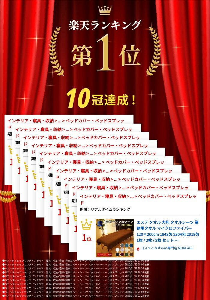 メーカー希望小売価格はメーカーカタログに基づいて掲載しています 商品情報商品番号10606-set商品名エステタオル 大判 タオルシーツ マイクロファイバー 業務用タオル 120×200cm 選べる厚さ 1枚 / 2枚 / 3枚 商品詳細 【 エステサロン・整体院・マッサージ・リラクゼーションサロン等に最適な業務用タオル 】■ 程よい厚さで吸水性と速乾性に優れており、生地がしっかりしているので、業務用タオルシーツとして最も適しております。【 心地の良い肌触り 】■ マイクロファイバーは、綿とは異なる特性を持っています。繊維内に三角形の形状があるため水を効果的に吸収できます。さらに、マイクロファイバーはふわふわとした肌触りがあり、弾力性もあります。触れると心地よく、柔らかな感触があります。【 優れた速乾性・耐久性 】■ 速乾性に優れているので、洗濯後に室内で干すだけで素早く乾きます。これにより、いつでも清潔で快適な状態を保つことができます。■ マイクロファイバーは耐久性があるため、何度も使用しても品質が劣化しにくく、長くご利用いただけるのでコスト面でもお得です。【 大判サイズでしっかりカバー 】■ 大判タオルシーツは、通常のシーツよりも広いサイズのため、ベッドやマットレス全体をしっかりとカバーし保護することができます。そのため、ベッドの寝具を一体感のある美しい状態に保つことができます。厚手タイプとは密度が非常に高く、そのため抜群の吸水力を誇ります。使用している生地は、厚手のタオルと同等かそれ以上の品質を持ち、しっかりとした重みと耐久性があります。毛足が短いことで分厚さは感じられないかもしれませんが、毛落ちが少なく、長期間使用しても変わらぬ品質を保つための設計です。この高密度で重厚感のあるタオルは、水分を素早く吸収し、確実に保持します。薄さを感じさせない吸水力としっかりとした重さで、日常使いから業務用としてまで幅広くご利用いただけます。匁数(重さ)厚手タイプ:約2918匁 (912g)通常タイプ:約2304匁 (720g)薄手タイプ:約1843匁 (575g)内容量1枚 / 2枚 / 3枚素材ポリエステル注意■マイクロファイバータオルは商品の特性上、濃い色の物は開封直後は洗濯時に色落ちがありますので、必ず単体で2〜3回は洗うようにしてください。■洗濯ネットのご使用をおすすめします。■塩素系漂白剤は使用しないでください。■柔軟剤の過度のご使用は、吸水性が落ちる場合がございますのでご注意ください販売元株式会社JSYRelated keywordsエステタオル 大判 タオルシーツ マイクロファイバー 業務用タオル 専門店 120×200cm 2918匁 1枚 / 2枚 / 3枚 モカ サンド ベージュ アイボリー ブラウン カーキ グリーン セージ サロンタオル 速乾 タオル 瞬間吸水 超 大判 バスタオル ベッドタオル ベッドカバー サロン マッサージ ベッド 折りたたみ 整体 ベッド シーツ 大判タオル 業務用 防災 用品 防災グッズ 備蓄 業務 ベッドシーツ タオル エステ 整体院 整骨院 マッサージベッド用シーツ 呼吸穴なし 薄手 中厚 厚手 極厚 業務用エステタオル 大判 タオルシーツ マイクロファイバー 業務用タオル 120×200cm 2304匁 2918匁 1枚 / 2枚 / 3枚 モカ サンド ベージュ アイボリー ブラウン カーキ グリーン セージ サロンタオル 速乾 タオル 瞬間吸水 超 大判 バスタオル ベッドタオル ベッドカバー サロン マッサージ 整体 ベッド シーツ 大判タオル 業務用 大判 タオルシーツ マイクロファイバー 120×200 5