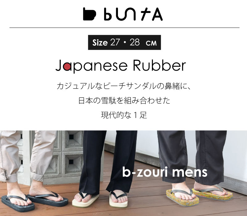 素材の未来へ 日本が誇るラバーブランド— buntA AIR rubber【モチーズ】の魅力 衝撃吸収性 衝撃吸収がなぜ大切か。 それは歩行時などの衝撃によるストレスを足が受け続けることが原因で 足が疲れたり、ふくらはぎや膝まで負担がかかってしまいます。 【モチーズ】は気泡が細かく密になっているため衝撃吸収性に優れています。 このお陰で【モチーズ】は足への負担や疲れを軽減し、しっかりとした歩行、蹴り出しをサポートしてくれます。 反発力 【モチーズ】の場合、AIR rubberの中でも気泡が細かく密になっているため、 履いていると反発力で自然と前に進んでいるかのような感覚で楽に歩行することが出来ます。 抜群の反発力で蹴り出しをサポートしてくれますので日頃の歩行が楽になり、疲れ知らずでアウトドアやお出掛けにも最適! 軽量 軽量で気持ちいい肌触り、歩きやすく持ち運びにもとても便利です。 カラー ひとつひとつ手作業で作り出すマーブル模様。 本体カラーに合わせて鼻緒やアウトソールをチョイス。 b-zouri mens 鼻緒:塩化ビニル 基材:特殊ゴム Made in Japan 室内でも屋外でも愉しめる、心地よいソフト感! 衝撃吸収性に優れており、心地よいソフト感は残しながら、耐候性や摩耗性も兼ね備えています。 そして、肌に優しく、抗菌・防臭仕様。 ホルムアルデヒド試験もパスしている、肌に優しい素材。さらに抗菌・防臭仕様も兼ね備えており、老若男女あらゆるライフスタイルに適応することができます。 *ハーフサイズの方は大きいサイズを選択することをお勧めしております。 例:26.5cm→43-44 注目ワード サンダル レディース メンズ 男性 ユニセックス かっこいい 和服 フラット サンダル 靴 歩きやすい 痛くならない 鼻緒 草履 わらじ ローヒール シューズ ビーチサンダル スリッパ 滑り止め ビーチスリッパ 夏 トレンド 日本製 高反発 低反発 国産シューズ 医療用インソールb-zouri mens 「伝統×モダン」 クセになる履き心地の良さはもちろん、職人が手作業で作るラバー模様はそれぞれがアート作品のように一つひとつ違う表情を見せる、特別な1足となります。カジュアルなビーチサンダルの鼻緒と、日本の伝統的な“雪駄(せった)”に履きやすさを組み合わせて現代的に更新したデザインのmens。 サイズ 43-44 45-46 日本サイズ 27cm 28cm buntA b-zouri mens 素材 鼻緒:塩化ビニル 基材:特殊ゴム サイズ(cm) 27cm/28cm 注意事項 ●模様は手作業の為、ひとつひとつ異なります。模様をお選びいただくことはできません。 ●商品写真はできる限り実物の色に近づけるよう徹底しておりますが、 お使いのモニター設定、お部屋の照明等により実際の商品と色味が異なる場合がございます。 ●お手元に到着後、商品を使う場所の光の質により(自然光、蛍光灯の下など)色の見え方が異なります。 ●イメージ違い・ご注文間違いなど、お客様ご自身のご都合での返金はお受け致しておりません。 ●ご注文前にサイズ・仕様・対応表記等を良くご確認の上、ご不明点はお問合わせ下さいませ。 ●また注文時・注文後は、ご注文内容に間違いが無いか、必ずご確認下さい。 ●当店では多店舗展開を行っております。 そのため在庫連動システムのタイムラグにより、在庫数更新が間に合わず ご注文頂いた商品が欠品となる場合もございますので、予めご了承ください。 商品の欠品がある場合は、欠品メールを送らせて頂きますので ご確認お願い致します。。