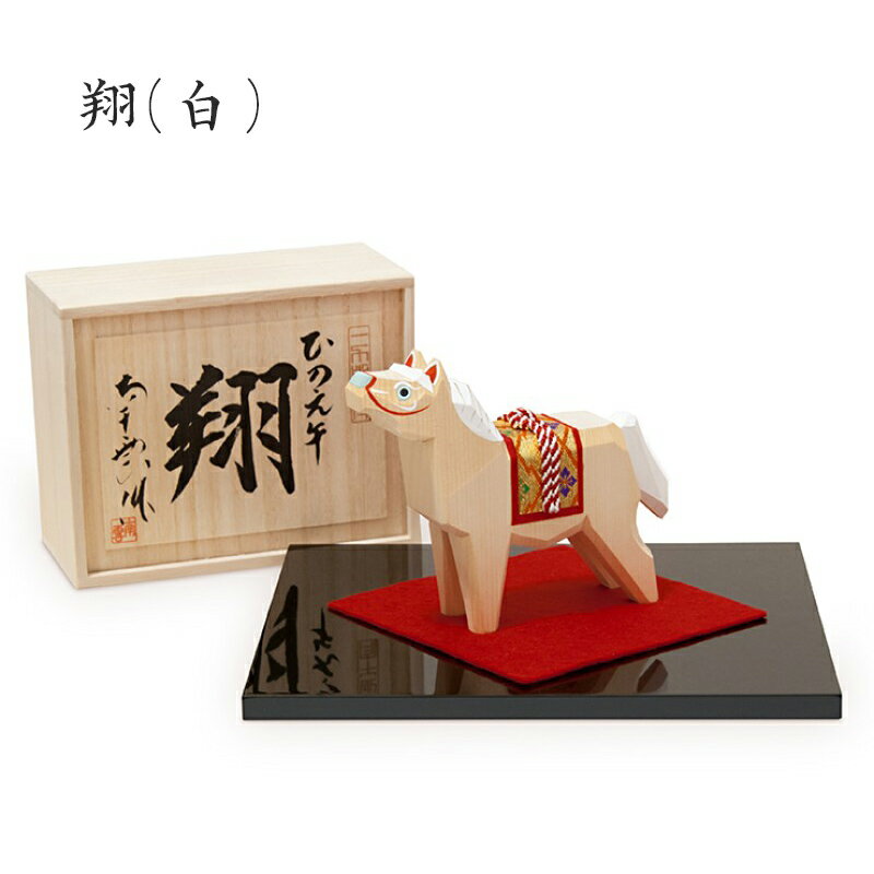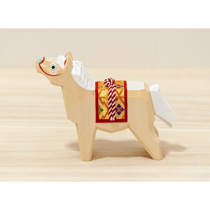 愛媛の一刀彫作家、南雲の一刀彫人形。 干支「午」をモチーフに作られた、かっこよさの引き立つ木彫の置物です。 一年の厄災を払ってくれるといわれる干支飾り。 令和8年の干支は「午(うま)」です。 「午(ご)」という漢字は、太陽が真南に位置する正午を表し、「頂点」「成熟」「繁栄」の意味を持ちます。 物事が最高潮に達し、エネルギーが満ち溢れる様子を象徴しています。 「午」は動物に当てはめると「馬」で、馬は古来より「力強さ」「スピード」「自由」の象徴とされてきました。 また、馬は人々を目的地へと導く存在として「進展」「成功」「信頼」のシンボルともされ、目標に向かって突き進む力強いエネルギーを表します。 手づくりならではのあたたかさと季節を感じるお人形として、玄関などのスペースに飾ってあげてください。 【サイズ】 本体:10.5×13cm 毛氈:12×12cm 台 :21×18cm 桐箱:15×12cm 【材質】 天然木(ヒバ)・水性顔料 箱 :天然木(桐) ●ギフト包装・のしを無料で承ります。 ご用命の場合はご注文フォームでお選びください。のしのお名前は備考欄にご記入ください。 「外のし」をご希望の場合は、備考欄にご記入ください。 特にご指定のない場合、「内のし」となります。 ●パソコンのモニターなどによって、商品の色が多少異なる場合がございます。 また、天然の草花や木材などを使用しているものは、使用する部位によって柄ゆきや色合いなどが変わってきます。予めご了承ください。