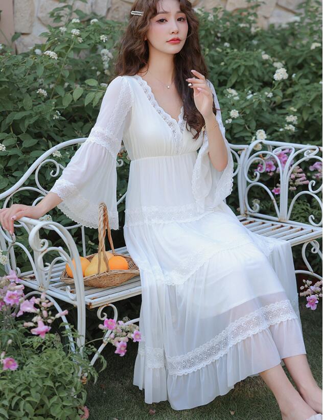 ネグリジェ パジャマ ロング丈部屋ルームウェア 宮廷風天使風 レディースファッションレースパジャマ Vネック エレガントワンピース お姫様 お嬢様ワンピース着心地良い 部屋着 肌触り良い 柔らかい ホワイト