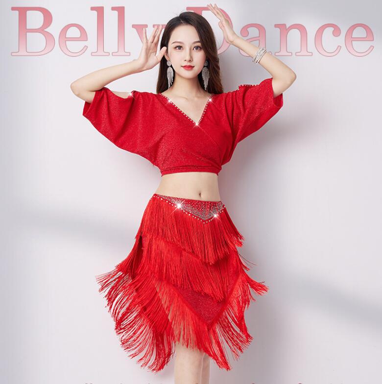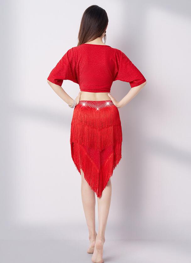 ベリーダンス衣装 上下2点セット レディース ラテンダンス ベリーダンス 社交ダンスウェア 五分袖 Vネック 肩に穴開け ショート丈トップス ショート 膝丈 フリンジ三段 スカート 三角形 サイドスリット ラインストーン ラメ きらきら セクシー インナーパンツ付き 黒 赤