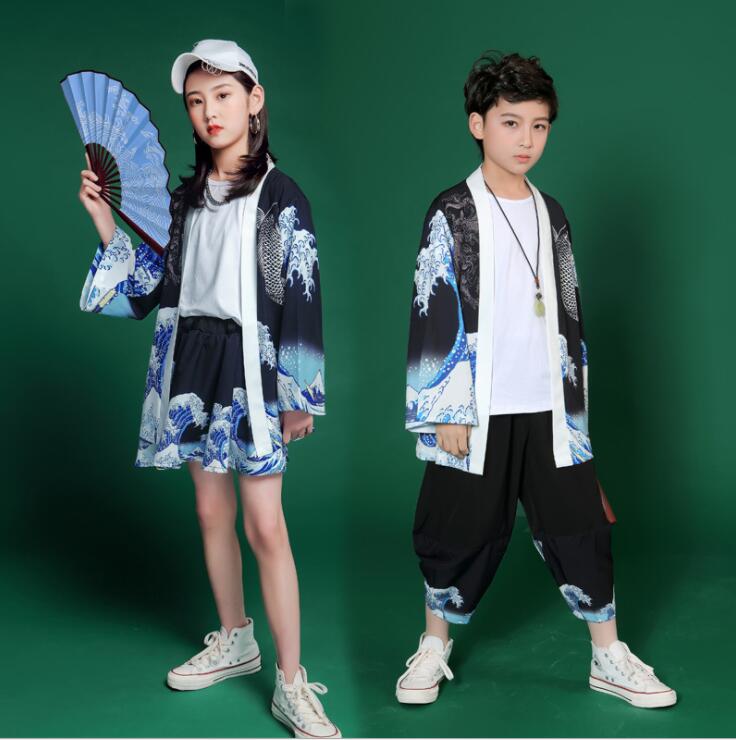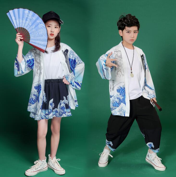子供ヒップホップダンス衣装 和風舞台ステージ衣装 男の子 女の子トップス+Tシャツ+パンツ/スカート3点セット 袴風 ダンスウェア キッズ カンフー 武術 表演服 モデルショー 公演服 イベントストリートダンスウェア