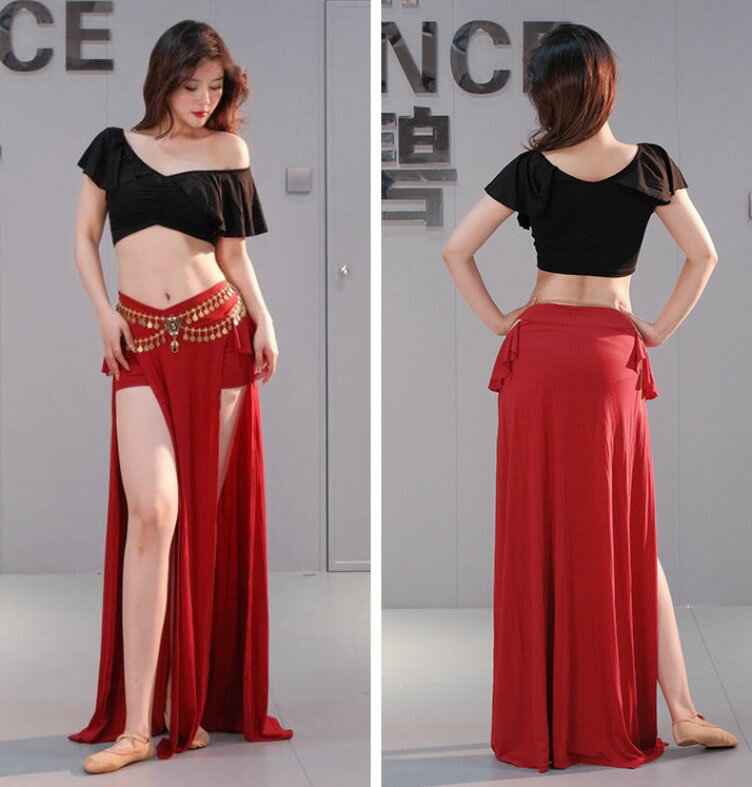 ベリーダンス 衣装セット チェーンベルト追加可能 レディース 大人 セクシー系 ベリーダンス 衣装 ショート丈 へそ出し 半袖 トップス ロング サイドスリット スカート 穴開け フリル 動きやすい ベリーダンス 社交ダンス ラテンダンス 練習着 レッスン着 赤 黒 白 紫 豹柄