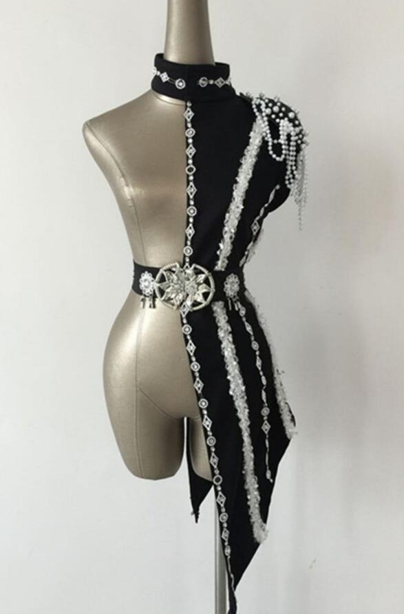 レディース ステージ衣装 パンク ジャズ ダンス 衣装 肩掛け シングル肩 ミドル丈 ベスト ベルト付き 半分 前後なし 右肩と左肩とも掛け可 レイヤード着 欧米 おしゃれ 個性 夜店 BAR クラブ 余興 ダンス衣装 ビーズ ラインストーン 派手 舞台 演出衣装 黒 赤