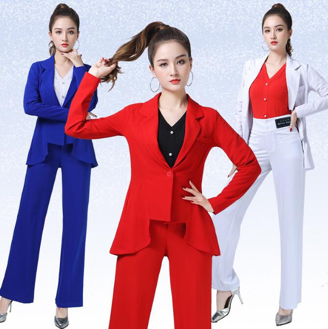 ステージ衣装 ダンス衣装 スーツ レディース ジルバ ラテンダンス モダンダンス 社交ダンス 衣装 薄め 長袖 カラー スーツ 舞台スーツ 裾フリル ロングパンツ ダンス 衣装 ダンス パンツ 1つ釦 女性 大人 クラブ 夜店 ジャズ カラオケ 演出服 単品とセット有 赤 青 白 黒