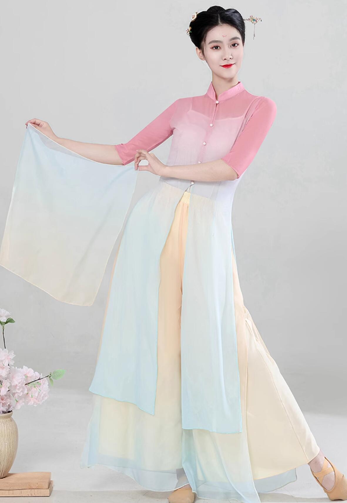 グラデーション 中華ダンス衣装 五分袖 ロング丈 チャイナブラウス チャイナドレス ガウチョパンツ 外側スリット ワイドパンツ 大人 中華古典ダンス 民族ダンス 社交ダンス 衣装 練習着 レッスン着 単品とセット購入可能 ピンク 緑 ブルー S M L XL