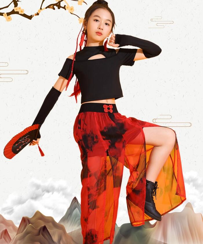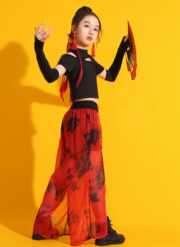 女の子 ヒップホップ ダンス衣装 4点セット キッズ 子供 中華風 ジャズ HIPHOP ストリートダンス 衣装 ハイネック 黒 半袖 Tシャツ 肩と鎖骨に穴開け 袖カバー(手袋)付き 赤い 染め シフォン 前にスリット ガウチョ ワイドパンツ 個性 エスニック おしゃれ 110~180cm