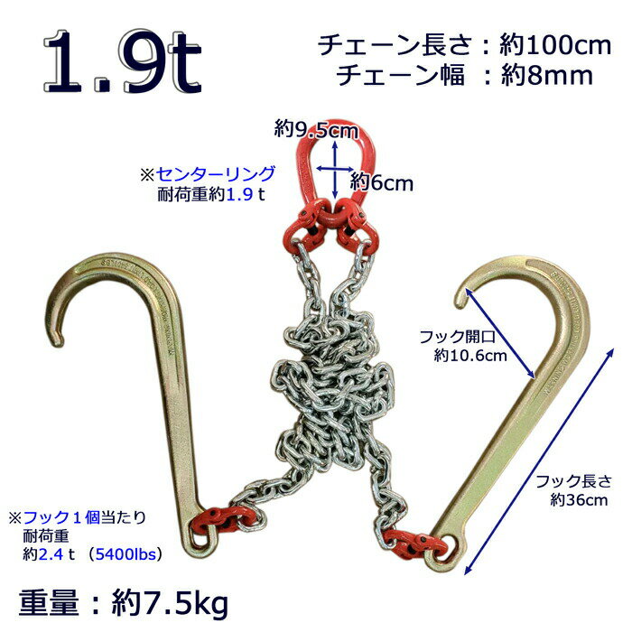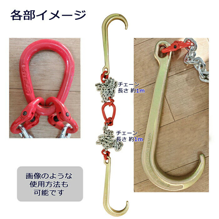 Jフックチェーン 2本吊り 牽引フック スリングチェーン 牽引チェーン トレーラーフック レッカー車 積載車 使用荷重1.9t チ ェーン式吊具