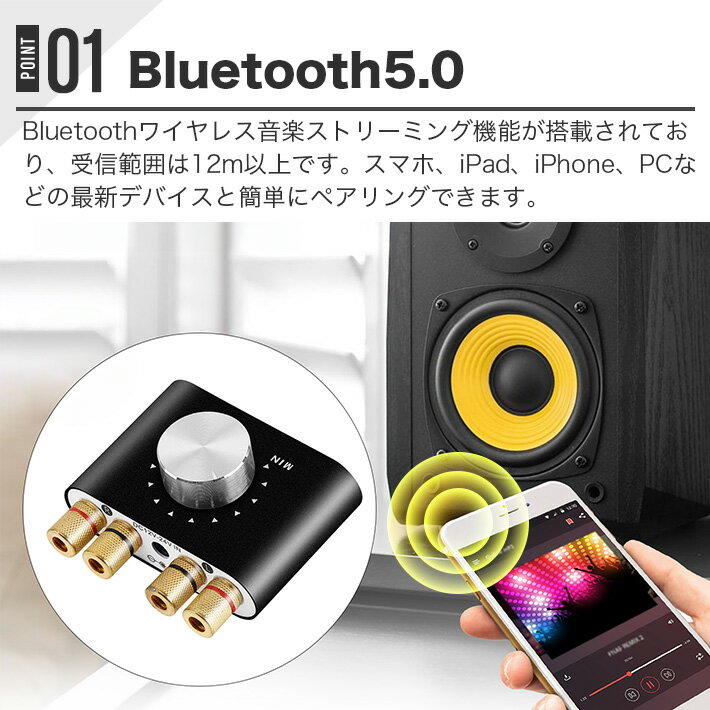 【Bluetooth5.0】サウンドアンプミキサーデバイスには、Bluetoothワイヤレス音楽ストリーミング機能が搭載されており、12メートル以上の受信範囲を誇ります。スマートフォン、iPad、iPhone、コンピューターなどの最新デバイスと簡単にペアリングできます。【USBメモリ/USBカード/AUXに対応】音楽のジャンルやお好みに合わせて調整が可能で、ボタン操作によりボリューム調整はもちろん、高音と低音の調整も行えます。歪みが少なく、音楽本来の音質を再現します。【Hi-Fiサウンド】最新のチップを採用し、50W×50Wの出力により、家庭用・車載用・マリン用・屋外用などの多くのパッシブスピーカーやサブウーファーを駆動できます。比類なきサウンド性能を提供します。【保護機能】過電圧、過電流、低電圧クリッピング、短絡、過熱に対する保護機能を備えています。【商品仕様】チャンネル数:2最大出力電力:最大50W×2歪み:0.4%SNR(信号対雑音比):80dB動作電圧:DC 12V〜24V / AC 110V商品サイズ:約7.5×5.2×3.5cm商品重量:約250g(本体)【パッケージ内容】アンプ×1、リモコン×1、3.5mm AUXケーブル×1、RCAケーブル×1、ACアダプター、日本語・英語ユーザーマニュアル