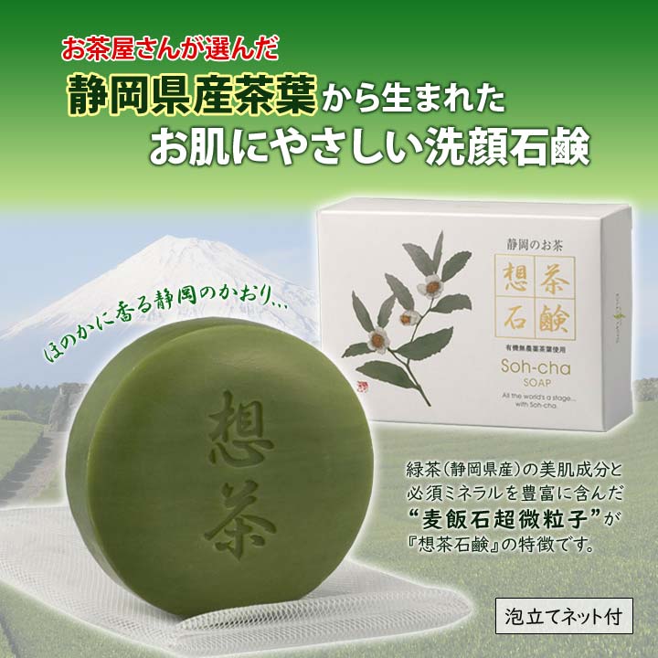 お茶屋さんが作った想茶石鹸 洗顔石けん せっけん 石けん ソープ 固形 美容 フェイス ボディ 顔 体 洗浄 洗う 有機無農薬 茶葉 無防腐剤 天然植物油脂 日本製
