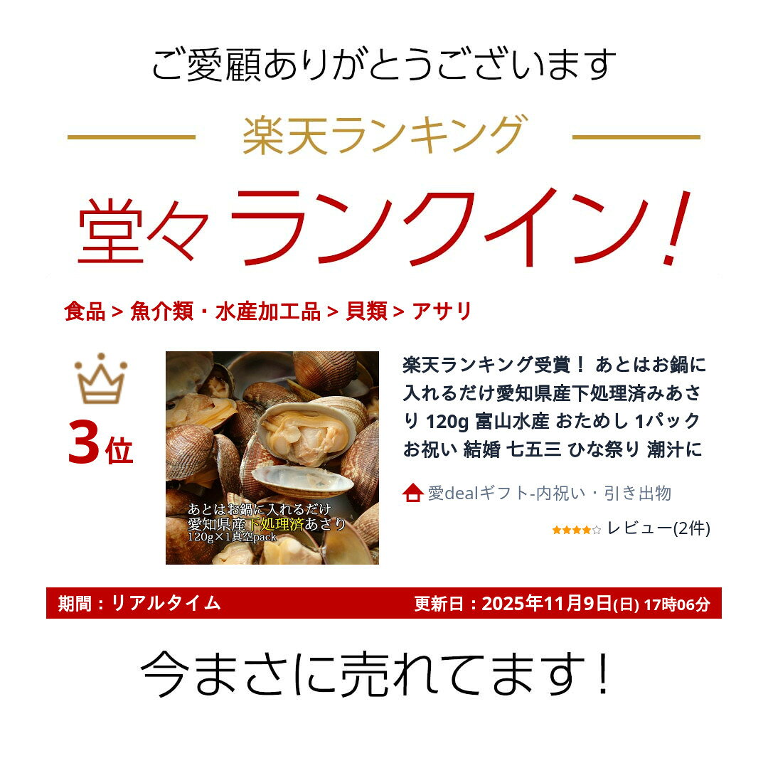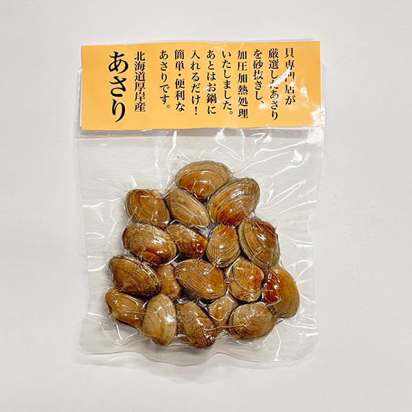 貝の大きさにより1パックあたりの個数が異なる場合がございます。予めご了承ください。砂抜き済みで下処理いらずの簡単調理あさりパックです。加熱加圧殺菌処理で、常温保存が可能! 名称:あさり(加熱処理済み) 原材料名:あさり(北海道産) 殺菌方法:気密性容器に密封し、加圧加熱殺菌 内容量:150g 賞味期限:製造日より常温で31日以上 保存方法:直射日光・高温多湿を避け、常温で保存 ※メーカーよりパッケージデザイン・産地情報等がリニューアルされた場合、最新の商品にて対応させていただく場合がございます。※在庫の変動によりお届けが予定よりお時間がかかる場合は、ご連絡させていただきます。 あらゆるご用途に最適なギフトをご用意しております。 内祝い・お返し » 出産内祝い 結婚内祝い 新築内祝い 快気祝い 入学内祝い 結納返し 香典返し 引き出物 結婚式 引出物 忌明け 開眼 法事 法要 引出物 お礼 謝礼 御礼 お祝い返し お祝い » 成人祝い 卒業祝い 結婚祝い 出産祝い 誕生祝い 初節句祝い 七五三祝い 入学祝い 卒業祝い 就職祝い 新築祝い 開店祝い 移転祝い 退職祝い 金婚式 還暦祝い 古希祝い 喜寿祝い 米寿祝い 退院祝い 昇進祝い 栄転祝い 叙勲祝い 季節のイベント » ‣1月 お年賀 正月 成人の日 ‣2月 節分 旧正月 バレンタインデー ‣3月 ひな祭り ホワイトデー 春分の日 春彼岸 卒業 卒園 お花見 春休み ‣4月 イースター 入学 就職 入社 新生活 新年度 春の行楽 ‣5月 ゴールデンウィーク こどもの日 母の日 母 日 mother's mother day ‣6月 父の日 ‣7月 七夕 お中元 暑中見舞 ‣8月 夏休み 残暑見舞い お盆 帰省 ‣9月 敬老の日 秋分の日 秋彼岸 シルバーウィーク ‣10月 孫の日 運動会 学園祭 ブライダル ハロウィン ‣11月 七五三 勤労感謝の日 ‣12月 お歳暮 クリスマス 大晦日 冬休み 寒中見舞い その他ギフト(法人用) » プレゼント お土産 手土産 プチギフト お見舞 ご挨拶 引越しの挨拶 誕生日 バースデー 結婚記念日 お取り寄せ 開店祝い 開業祝い 周年記念 記念品 お茶請け 菓子折り おもたせ 贈答品 挨拶回り 定年退職 転勤 来客 ご来場プレゼント ご成約記念 表彰 メッセージ例 » ハッピーバースデー Happy Birthday! お誕生日おめでとう お疲れさま ありがとう ありがとうございます 感謝しています おめでとう お世話になりました よろしく ごめんね 頑張ってください 頑張れ! 気持ちです 心を込めて レビュー抜粋 » 大満足 丁寧 とても かわいい 可愛い 素敵 安心 素早い 対応 品揃え 豊富 迅速な対応 予備ののし フォトカードあらゆるご用途に最適なギフトをご用意しております。 内祝い・お返し » 出産内祝い 結婚内祝い 新築内祝い 快気祝い 入学内祝い 結納返し 香典返し 引き出物 結婚式 引出物 忌明け 開眼 法事 法要 引出物 お礼 謝礼 御礼 お祝い返し お祝い » 成人祝い 卒業祝い 結婚祝い 出産祝い 誕生祝い 初節句祝い 七五三祝い 入学祝い 卒業祝い 就職祝い 新築祝い 開店祝い 移転祝い 退職祝い 金婚式 還暦祝い 古希祝い 喜寿祝い 米寿祝い 退院祝い 昇進祝い 栄転祝い 叙勲祝い 季節のイベント » ‣1月 お年賀 正月 成人の日 ‣2月 節分 旧正月 バレンタインデー ‣3月 ひな祭り ホワイトデー 春分の日 春彼岸 卒業 卒園 お花見 春休み ‣4月 イースター 入学 就職 入社 新生活 新年度 春の行楽 ‣5月 ゴールデンウィーク こどもの日 母の日 母 日 mother's mother day ‣6月 父の日 ‣7月 七夕 お中元 暑中見舞 ‣8月 夏休み 残暑見舞い お盆 帰省 ‣9月 敬老の日 秋分の日 秋彼岸 シルバーウィーク ‣10月 孫の日 運動会 学園祭 ブライダル ハロウィン ‣11月 七五三 勤労感謝の日 ‣12月 お歳暮 クリスマス 大晦日 冬休み 寒中見舞い その他ギフト(法人用) » プレゼント お土産 手土産 プチギフト お見舞 ご挨拶 引越しの挨拶 誕生日 バースデー 結婚記念日 お取り寄せ 開店祝い 開業祝い 周年記念 記念品 お茶請け 菓子折り おもたせ 贈答品 挨拶回り 定年退職 転勤 来客 ご来場プレゼント ご成約記念 表彰 メッセージ例 » ハッピーバースデー Happy Birthday! お誕生日おめでとう お疲れさま ありがとう ありがとうございます 感謝しています おめでとう お世話になりました よろしく ごめんね 頑張ってください 頑張れ! 気持ちです 心を込めて レビュー抜粋 » 大満足 丁寧 とても かわいい 可愛い 素敵 安心 素早い 対応 品揃え 豊富 迅速な対応 予備ののしフォトカード おしゃれ 手提げ袋が無料 あとはお鍋に入れるだけ北海道産下処理済みあさり
