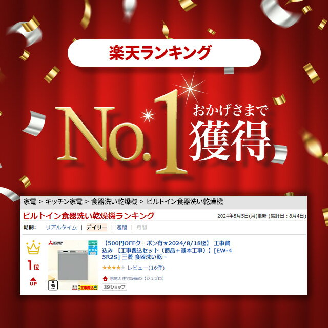 06.関連商品・おすすめ品【キーワード】ビルトイン食洗機 / 食洗器 / 食器洗い乾燥機EW-45R2S-KJ本商品ページの目次01.商品説明商品概要三菱 食器洗い乾燥機スリムデザインドアパネル型コンパクトタイプ 約5人分(40点)食洗機 食器洗い機 ビルトイン食洗機幅45cmEW-45R1Sの後継品シルバー除菌洗浄・除菌乾燥カラーナビ食器かご乾燥専用ヒーター低騒音設計結露防止フィルターお手入れランプソフト排気フラット洗浄槽少人数対応 3 2人コース搭載ターボ噴射専用洗剤投入口調理小物セット可【別売りの専用キャビネットが必要になる場合があります。必要な場合はご注文後に当店よりご案内します】食器洗い乾燥機:EW-45R2S×1 工事費:CONSTRUCTION-DISH×1 02.工事内容・対応地域03.安心の評価・選ばれる理由04.購入前の確認点ドアパネル(化粧パネル)について05.購入手続き