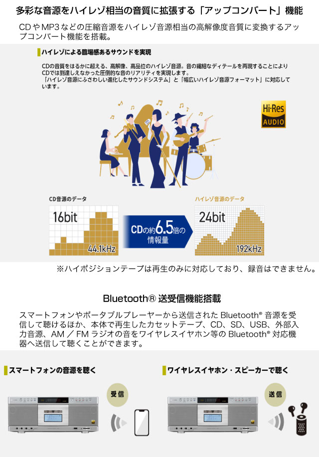 【キーワード】TOSHIBA / オーレックス / 【 TY-AK21-S の後継品 】AX-KCR90-S 商品説明シリーズ ハイレゾ対応SD/USB/CDラジオカセットレコーダー AUREXカラー シルバー仕様・特徴 40Wスピーカーシステム搭載、ハイレゾ再生可能なCDラジカセハイレゾ/アップコンバート機能対応対応メディア:CD、カセットテープ、SDカード、USBメモリーFMラジオ、AMラジオスピーカー出力:20W+20wBluetooth送受信機能搭載電源:AC100V 50/60Hzラジオタイマー録音タイマー再生リモコン付属【ラジオ受信周波数】FM:76.0〜108.0MHz(0.1MHzステップ)AM:531〜1710kHz(9kHzステップ)サイズ 外形寸法:350(幅)×126(高さ)×218(奥行)mm(突起物含まず)重量 質量:約3.0kg付属品電源コード、リモコン(リチウム電池付属)、AMループアンテナ、取扱説明書(保証書付き)、 受信周波数一覧表、ヘッドクリーニングキット発売日 2025年10月旧品番 TY-AK21-S の後継品