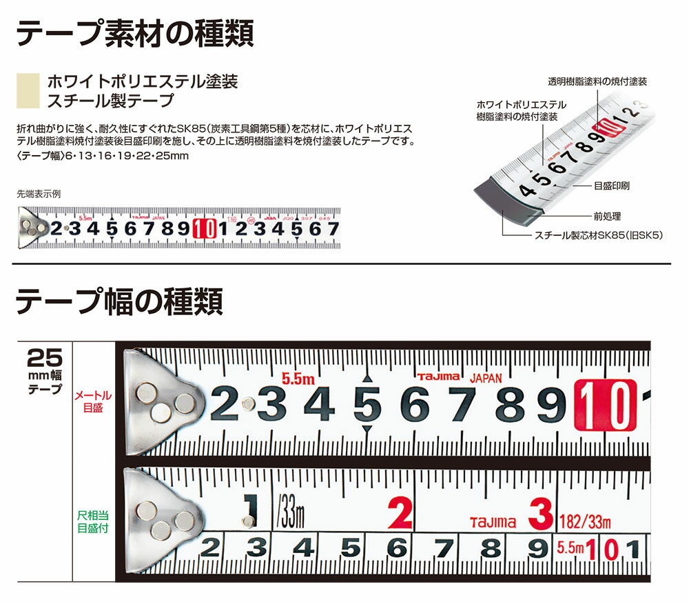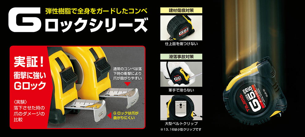 ●落下時に建材にダメージを与えない、アーマードケース仕様 ●落下時の衝撃から爪を守るフックガードバンパー ●0点補正移動爪 ●ショックアブソーバー付 ●目盛仕様: メートル目盛、JIS1級 ●テープ幅: 25mm ●テープ長さ: 5.5m ●重量: 315g ●ヨンゴーゴーピッチ表示付 ●ストラップ付 ●大型ベルトクリップ付 ●爪飛び防止用プロテクター付 ●材質: テープ:SK85(旧SK5)、バネ:SK85(旧SK5)、ケース:ABS樹脂、カバー:エラストマー樹脂 【メーカー名】(株)TJMデザイン 【メーカー品番】GL25-55BL