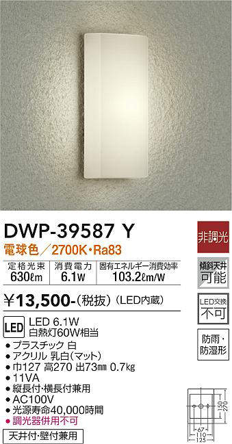 大光電機(DAIKO) 玄関灯 シンプル角タイプ 【品番:DWP-39587Y】