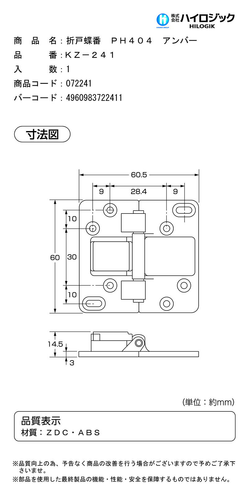 【メール便対応】ハイロジック TQOOL KZ-241 折戸蝶番 PH404 1個入 アンバー 【品番:72241】