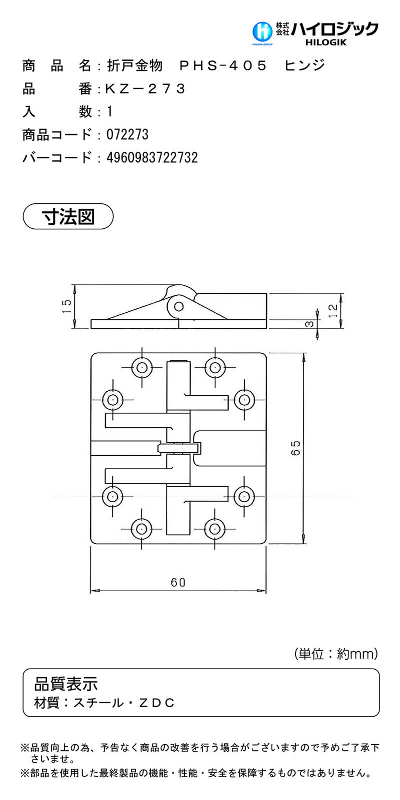 【メール便対応】ハイロジック TQOOL KZ-273 折戸金物 PHS-405 ヒンジ 1個入 アンバー 【品番:72273】