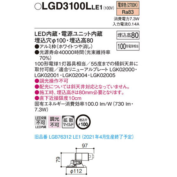 【LGD3100LLE1】 パナソニック ベースダウンライト LED交換不可 調光不可