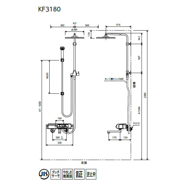 ●170mmパイプ付 ●高温出湯温度規制(約50℃) ●本体タッチサーモ(吐水口側・シャワー側とも出し止めがワンタッチ式) ●メッキオーバーヘッドシャワー(eシャワー)丸 ●メッキハンドシャワー(eシャワーNf) ●ニューメタリックホース1.6m/メッキハンガー ●一般地用のみ ●最低使用水圧:0.14MPa ●右仕様 ◆商品型番 ・KVK ・KF3180 商品画像はイメージです。品番でのご注文となりますので、仕様やお色味などは事前にメーカーへご確認下さい。◆メーカー問合せ先 KVK【0570-099-552】