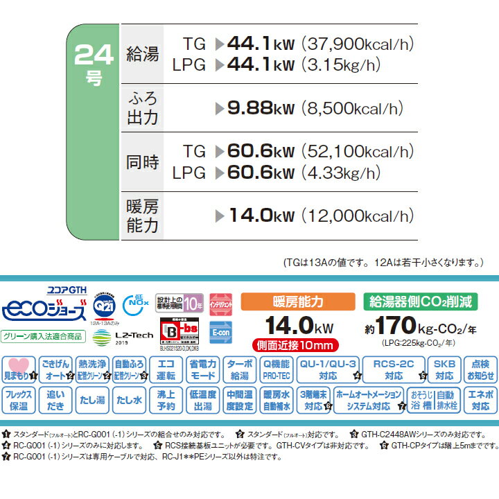 ●サイズ:幅480×高さ750×奥行き240 (mm) ●号数:24号 ●機能:シンプル(オート) ●接続:2温度6P内蔵 ●生産ガス種:都市ガス(12A13A) ●設置形:PS扉内設置形(超高層対応) ●省エネ基準達成率(%):112 ●給湯熱効率(%):95.0 ●暖房熱効率(%):87.0 ●エネルギー消費効率(%):93.0 ●3年保証対象商品 ●リモコン別売り ◆商品型番 ・ノーリツ ・GTH-CP2461SAW6H-T-1BL 商品画像はイメージです。品番でのご注文となりますので、仕様やお色味などは事前にメーカーへご確認下さい。◆メーカー問合せ先 【ノーリツ0120-911-026】