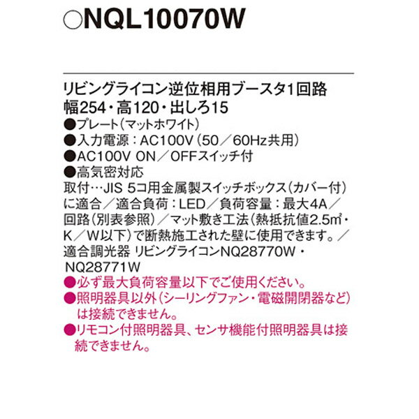 【NQL10070W】 パナソニック コントローラ リビングライコン 逆位相2.5Aタイプ 5コ口サイズ LED専用 ブースタ逆位相 1回路タイプ