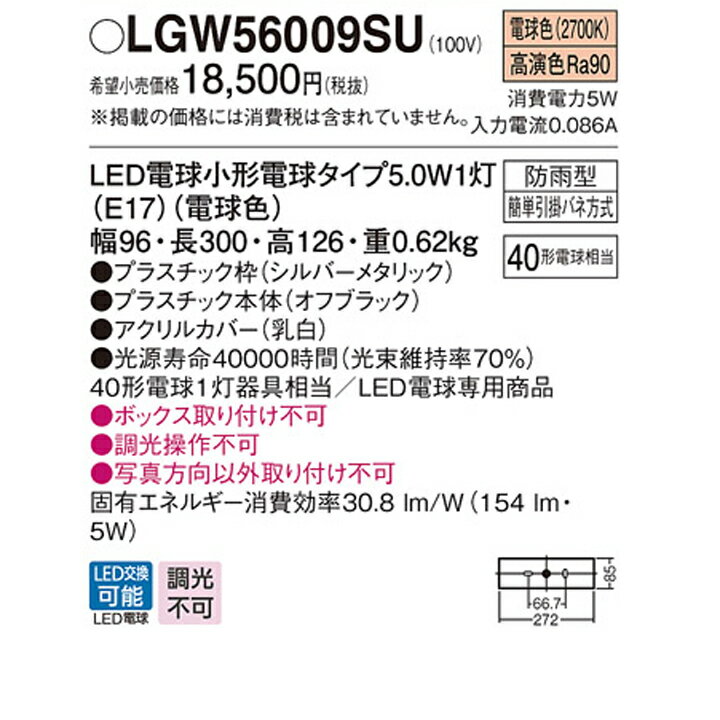 ●ランプ同梱包 光源 ●LED電球小形電球タイプ5.0W1灯(E17)(電球色) ●色温度:2700K ●光源寿命40000時間(光束維持率70%) 寸法・質量 ●幅:96mm ●長:300mm ●高:126mm ●質量:0.62kg 仕様・注意事項 ●器具光束:154lm ●電圧:100V ●消費電力:5W ●消費効率:30.8lm/W ●デザイン分類:Stylish Modern ●【プラスチック枠】シルバーメタリック ●【プラスチック本体】オフブラック ●【アクリルカバー】乳白 ●据置取付型 ●高演色Ra90 ●40形電球1灯器具相当 ●LED電球専用商品 ●入力電流(100V時):0.086A ●ボックス取り付け不可 ●調光操作不可 ●写真方向以外取り付け不可 ●商品型番 ・パナソニック(Panasonic) ・LGW56009SU 商品画像はイメージです。品番でのご注文となりますので、仕様やお色味などは事前にメーカーへご確認下さい。●メーカー問合せ先 【0120-878-709】
