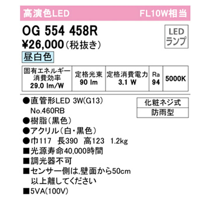 ●直管形LED ●樹脂(黒色) ●アクリル(白・黒色) ●巾117長390高1231.2kg ●光源寿命40000時間 ●調光器不可 ●センサー側は、壁面から50cm以上離してください ●ランプ個数:1 ●ランプ品番:NO460RB ◆商品型番 ・オーデリック ・OG554458R 商品画像はイメージです。品番でのご注文となりますので、仕様やお色味などは事前にメーカーへご確認下さい。◆メーカー問合せ先【03-3332-1123】