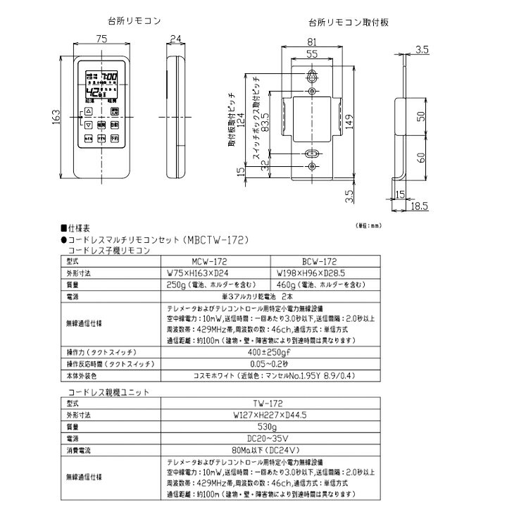 ●浴室リモコン(BCW-172): 外形寸法:高さ96×幅198×奥行28.5mm ●台所リモコン(MCW-172): 外形寸法:高さ163×幅75×奥行24mm ●通信ユニット(TW-172) 外形寸法:高さ227×幅127×奥行44.5mm ●ケーブル工事の必要がないコードレスリモコン。コードレスリモコンタイプの熱源機・ふろ給湯器でも、安心して取り替えられます。 ●壁貫通取り付けの場合は、BC壁貫通取付セットBC-KT-3(24-5016)をご使用ください。 ◆商品型番 ・リンナイ ・MBCTW-172 商品画像はイメージです。品番でのご注文となりますので、仕様やお色味などは事前にメーカーへご確認下さい。◆メーカー問合せ先 【0120-054-321】