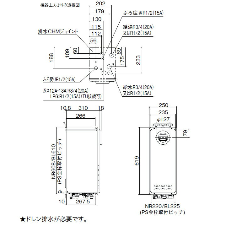 【GT-CP2063SAWX-PS BL】ノーリツ ガスふろ給湯器 設置フリー形 屋外壁掛形/PS標準設置形 都市ガス R3/4(20A) NORITZ